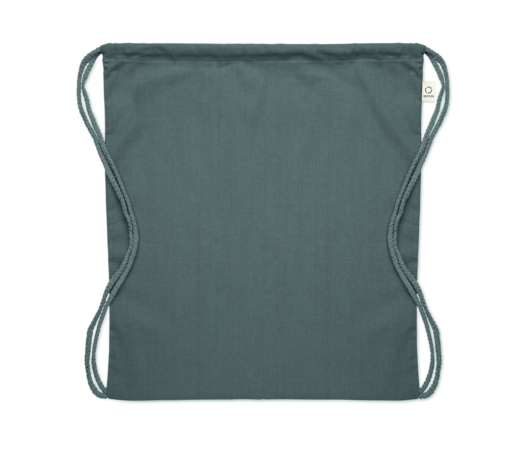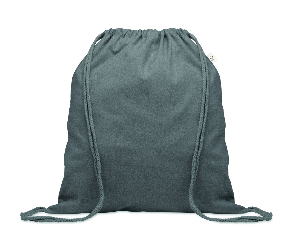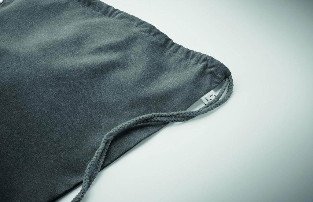 Húzózsinóros táska 30% fogyasztás előtti újrahasznosított pamutból és 30% RPET-ből. 140 g/m². Ez az anyag nyomtatás után zsugorodhat.