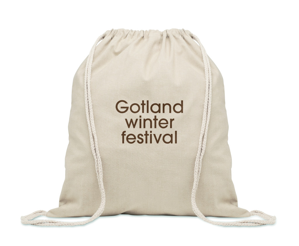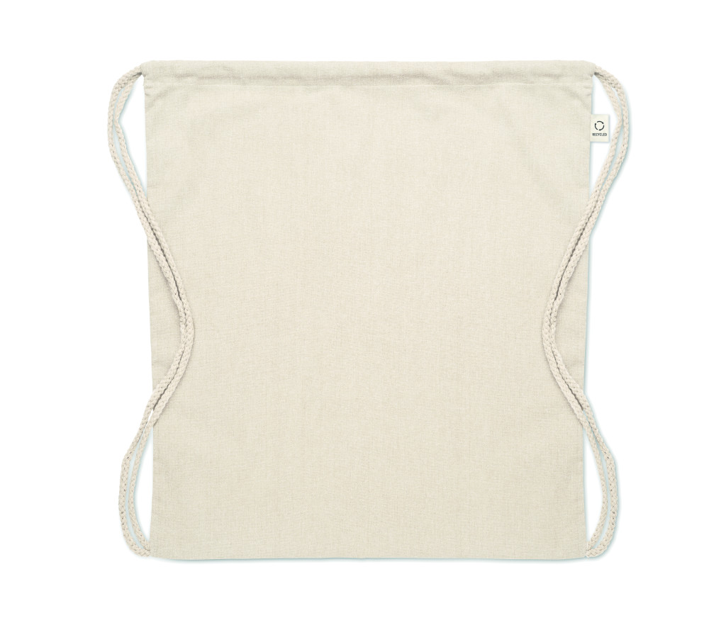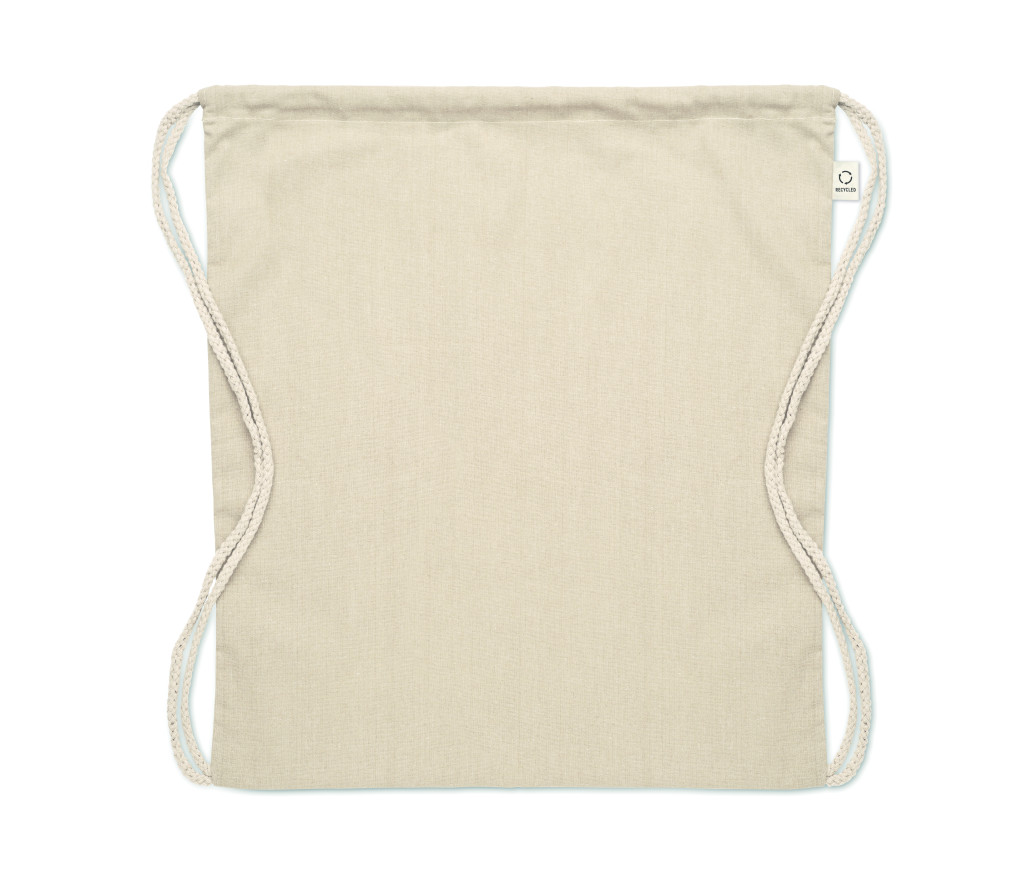 Húzózsinóros táska 30% fogyasztás előtti újrahasznosított pamutból és 30% RPET-ből. 140 g/m². Ez az anyag nyomtatás után zsugorodhat.