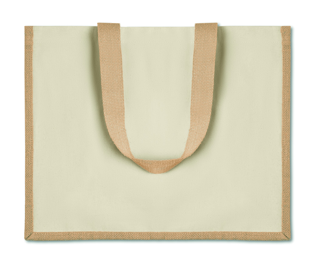 Laminált juta bevásárlótáska. Vászon elülső rész és hosszú, pamut fül. Ez a termék OEKO-TEX® STANDARD 100 tanúsítvánnyal rendelkezik.