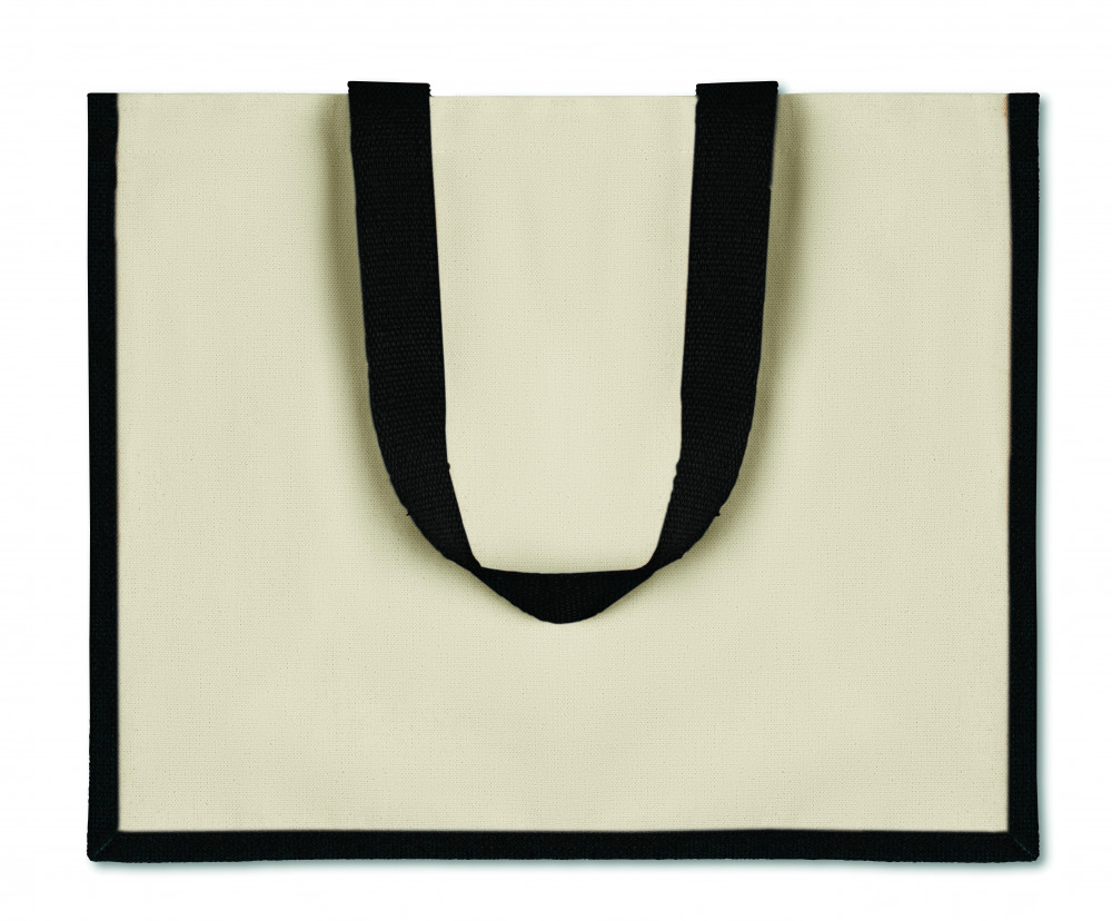 Laminált juta bevásárlótáska. Vászon elülső rész és hosszú, pamut fül. Ez a termék OEKO-TEX® STANDARD 100 tanúsítvánnyal rendelkezik.
