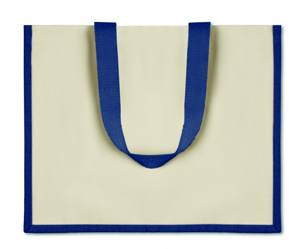 Laminált juta bevásárlótáska. Vászon elülső rész és hosszú, pamut fül. Ez a termék OEKO-TEX® STANDARD 100 tanúsítvánnyal rendelkezik.