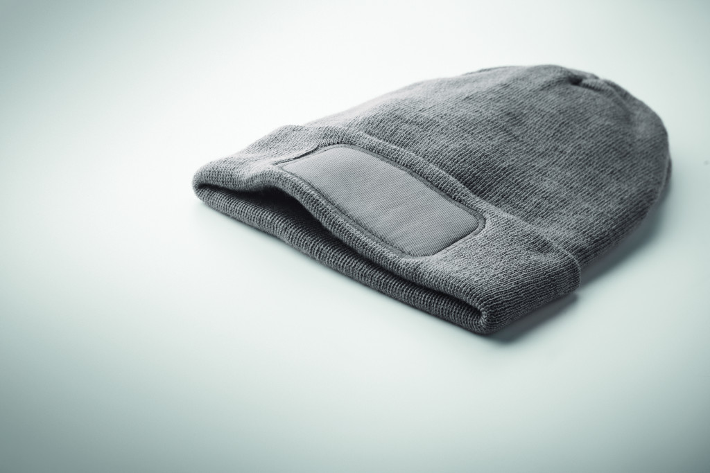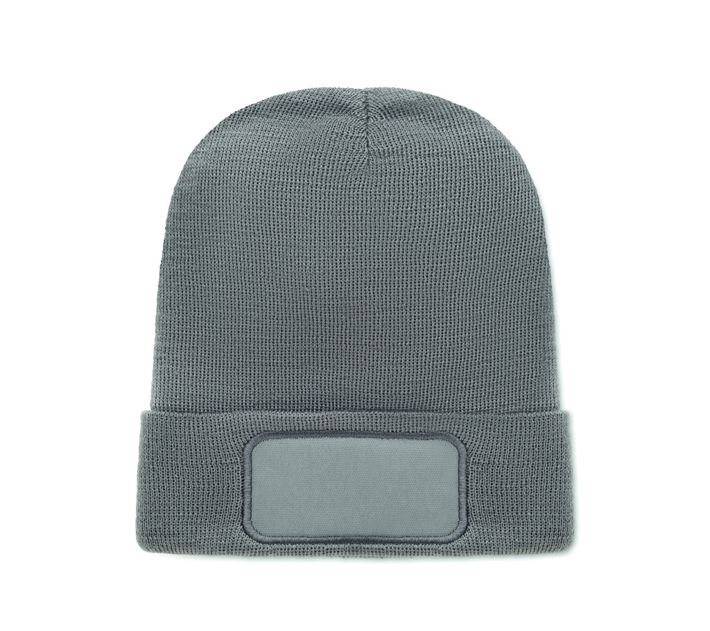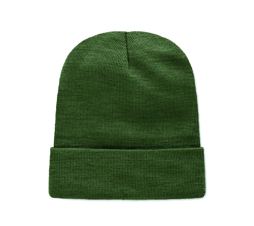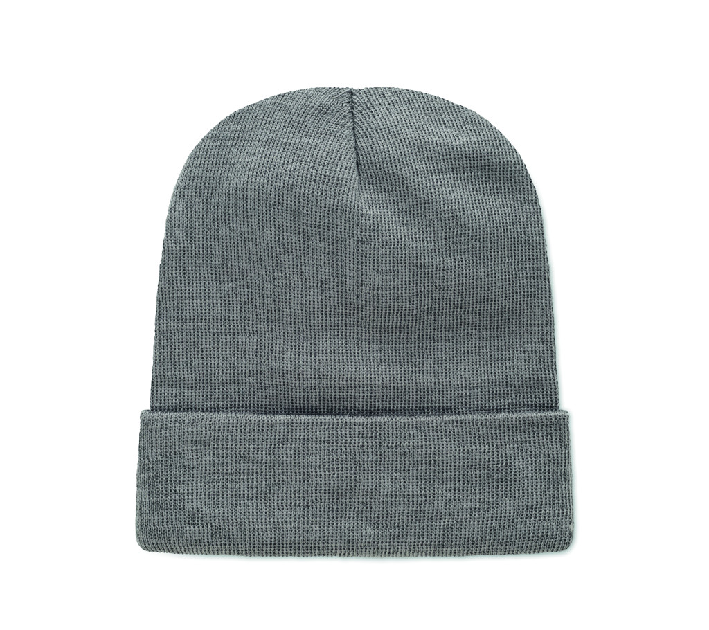 Uniszex kötött sapka, puha rugalmas RPET poliészterből, mandzsettával és felvarróval.