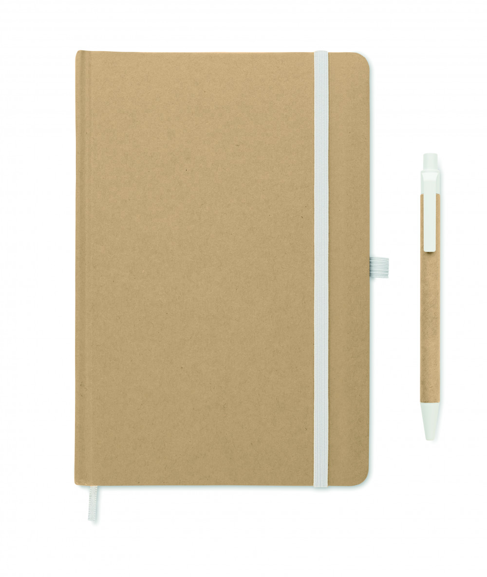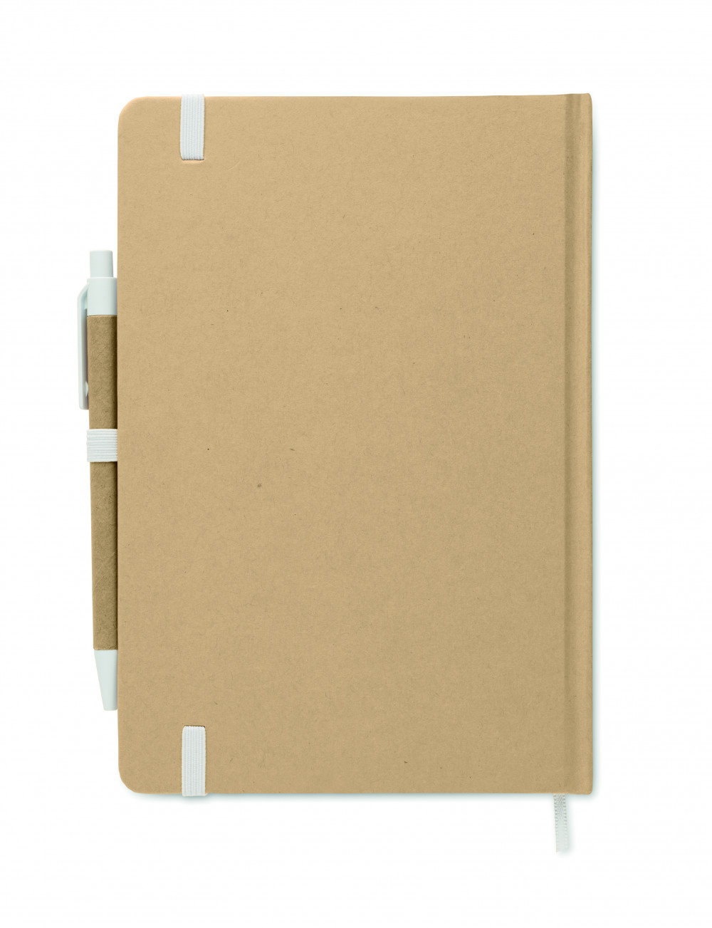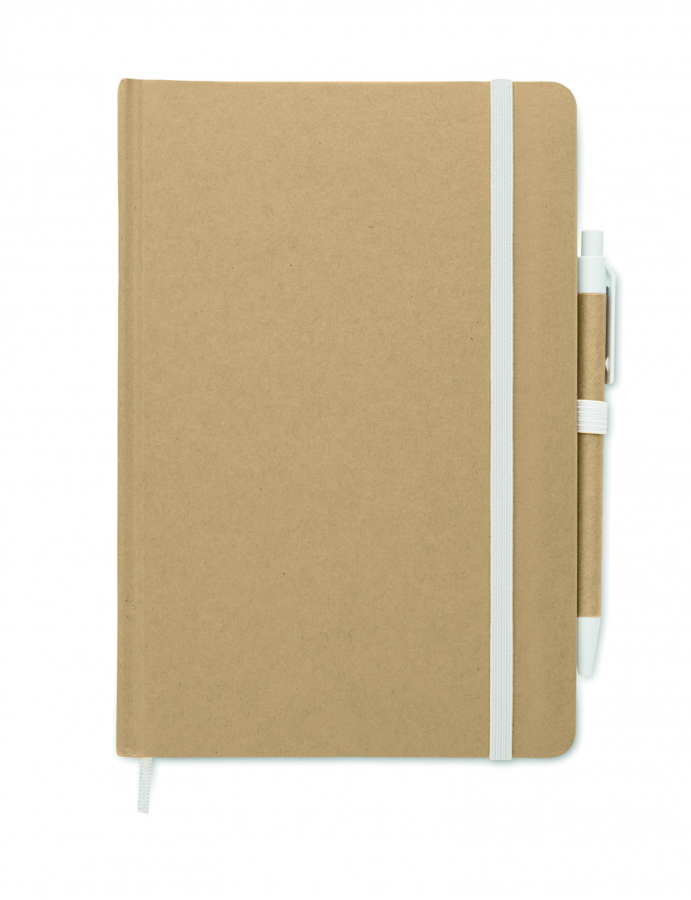 A5 jegyzetfüzet keménytáblás, újrahasznosított karton borítóval. Cérnafűzött. 160 vonalas oldal (80 lap) újrahasznosított papírból. Elasztikus zárópánt, tolltartó hurok és könyvjelző szalag. Nyomógombos golyóstoll újrahasznosított papír tolltesttel. Kéken író betét.