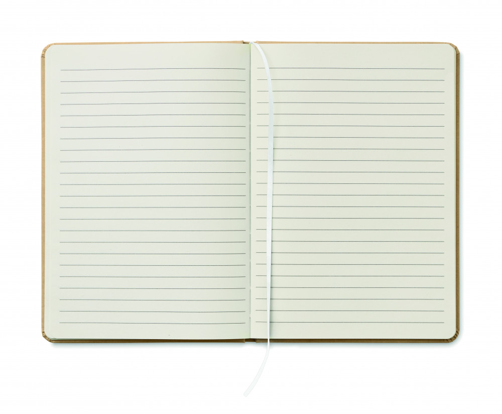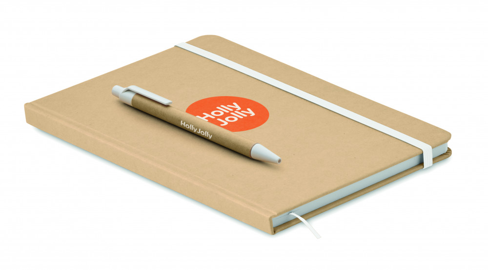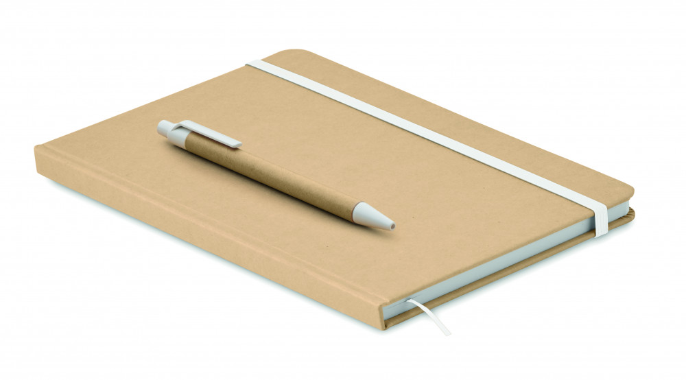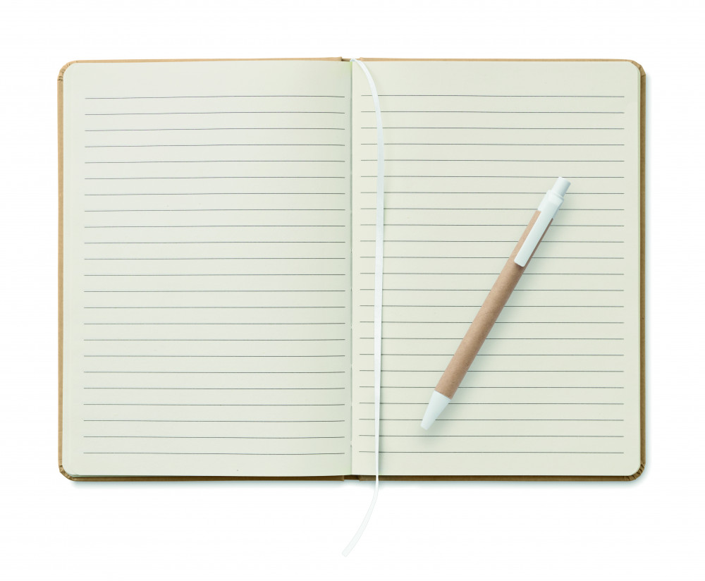 A5 jegyzetfüzet keménytáblás, újrahasznosított karton borítóval. Cérnafűzött. 160 vonalas oldal (80 lap) újrahasznosított papírból. Elasztikus zárópánt, tolltartó hurok és könyvjelző szalag. Nyomógombos golyóstoll újrahasznosított papír tolltesttel. Kéken író betét.