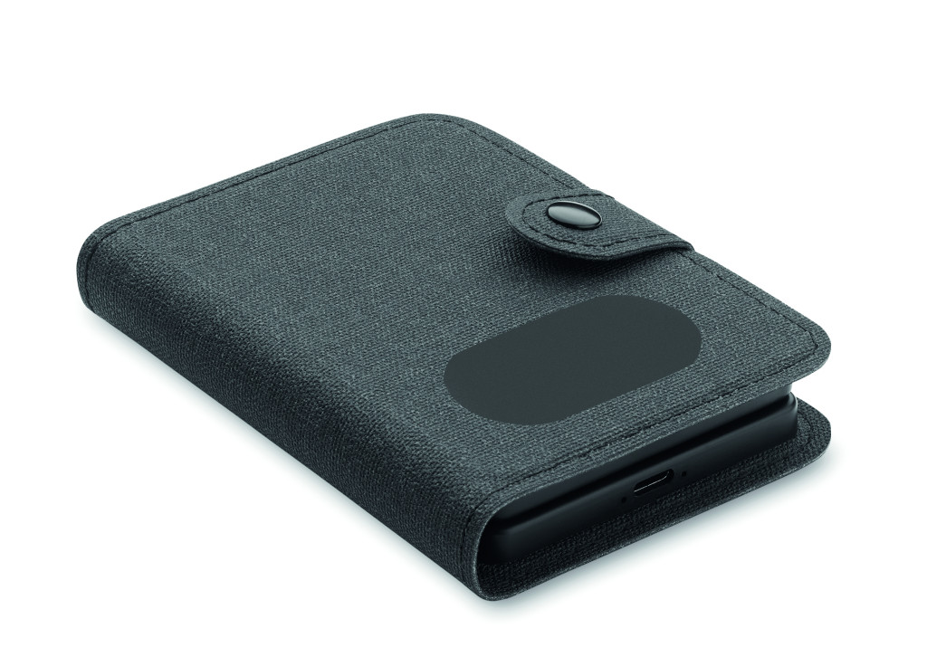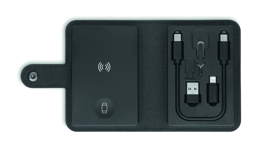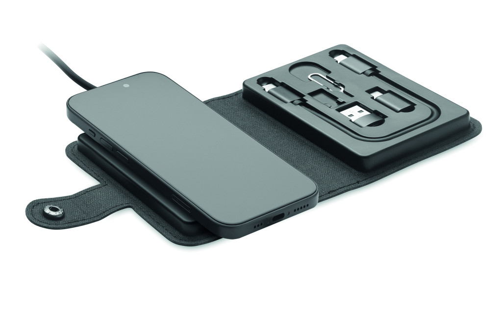 Kábelcsatlakozó készlet 15 W-os vezeték nélküli töltővel, okosóra töltővel (csak Apple®). 4 az 1-ben töltőkábel, SIM kártya kiszedő tű. Újrahasznosított PU + RPET borítás, újrahasznosított ABS műanyag és újrahasznosított alumínium lemez a fedlapon.