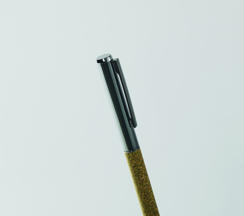 Csavarzáras fém golyóstoll, 20% teazaccból, 30% parafából, 50% poliészter-pamut keverékből készült tolltesttel, kartondobozban. Kéken író betéttel.