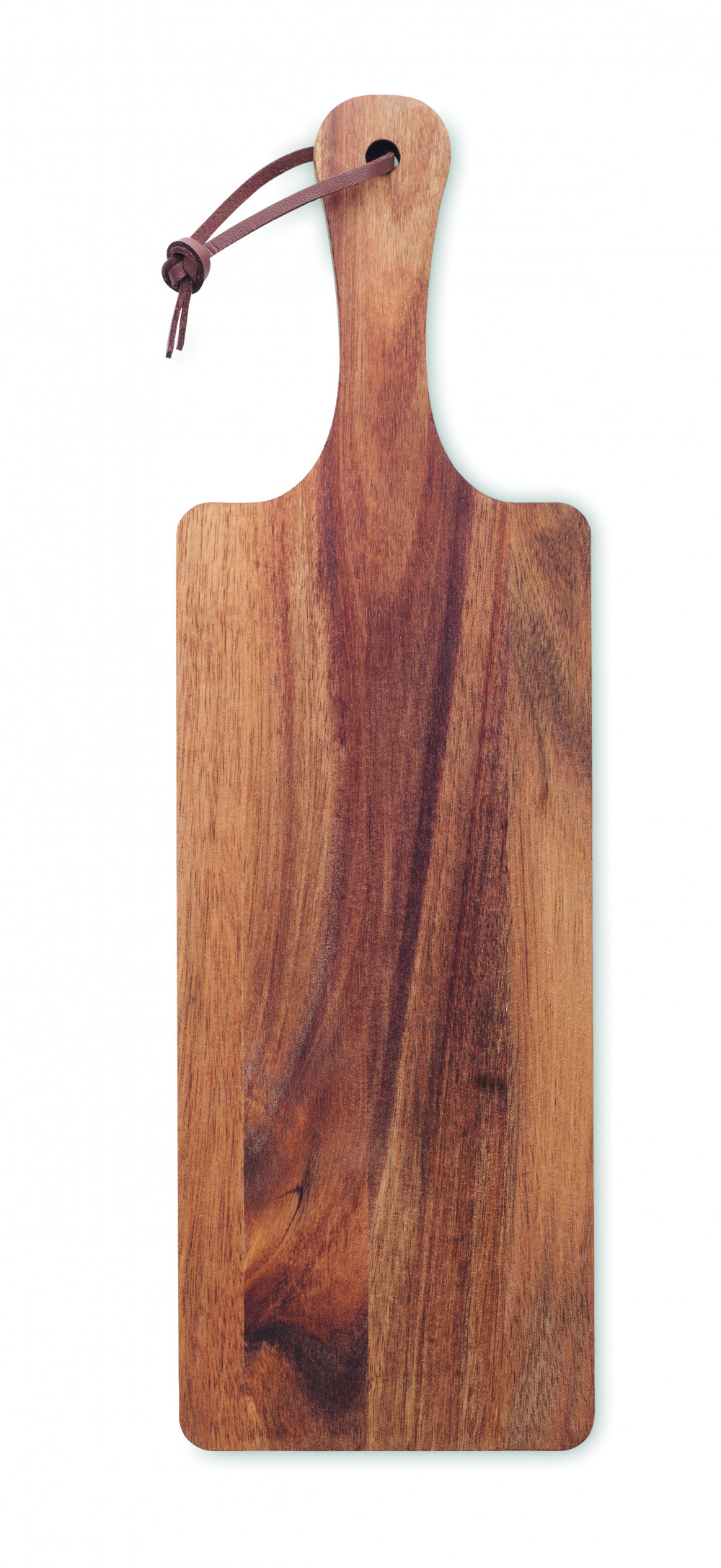 Akáciafa tálalódeszka fogantyúval, PU zsinórral. A fa természetes anyag, termékenként szín- és méretbeli eltérések jelentkezhetnek, ami befolyásolhatja a dekoráció végső eredményét.