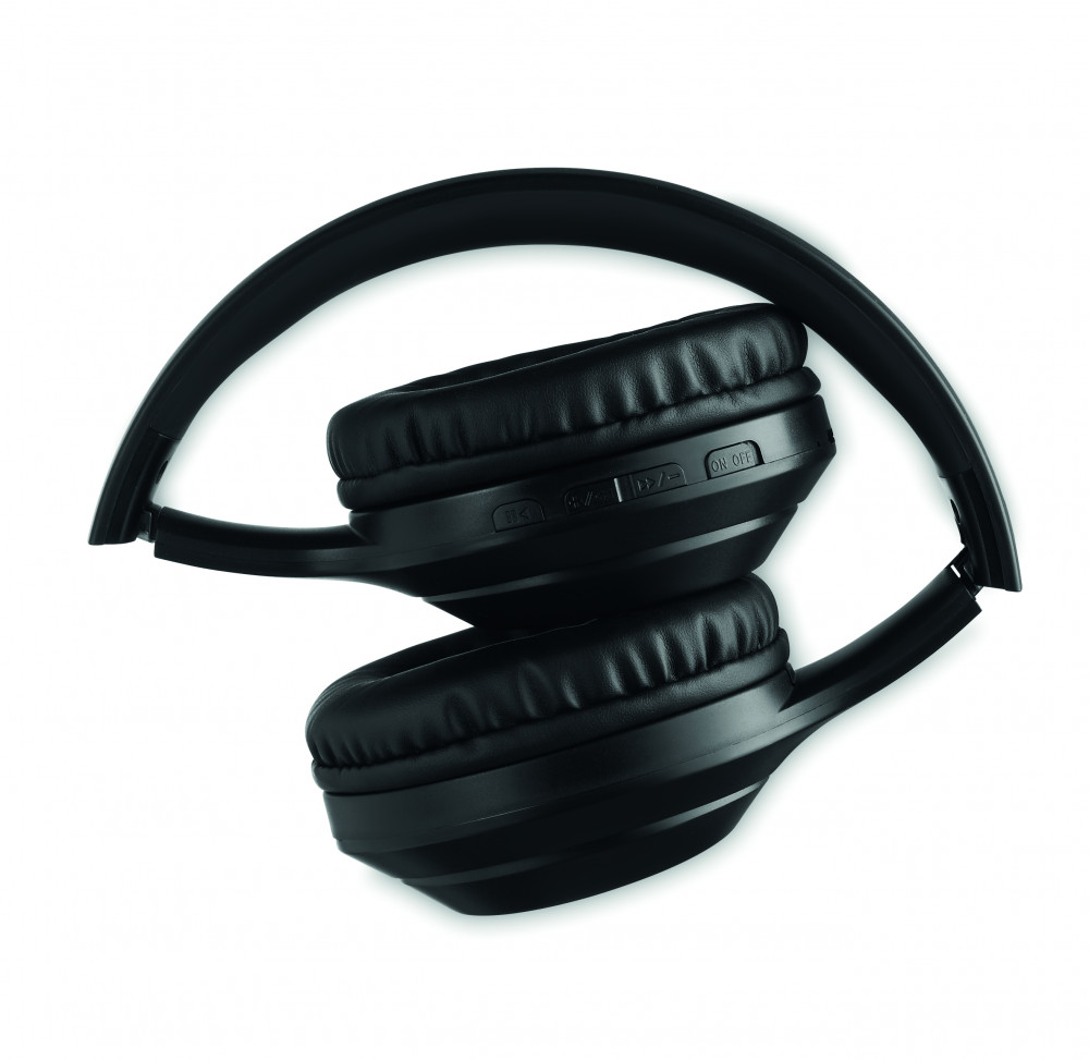 5.0 vezeték nélküli, összecsukható fejhallgató ABS-ből, 140 g vastag húzózsinóros pamuttasakba csomagolva. Újratölthető 200 mAh lítium- polimer akkumulátorral. Beépített kihangosító funkció és mikrofon. Üzemidő kb. 4 óra. Mikro USB töltőkábelt tartalmaz. Működési tartomány: 10 m.