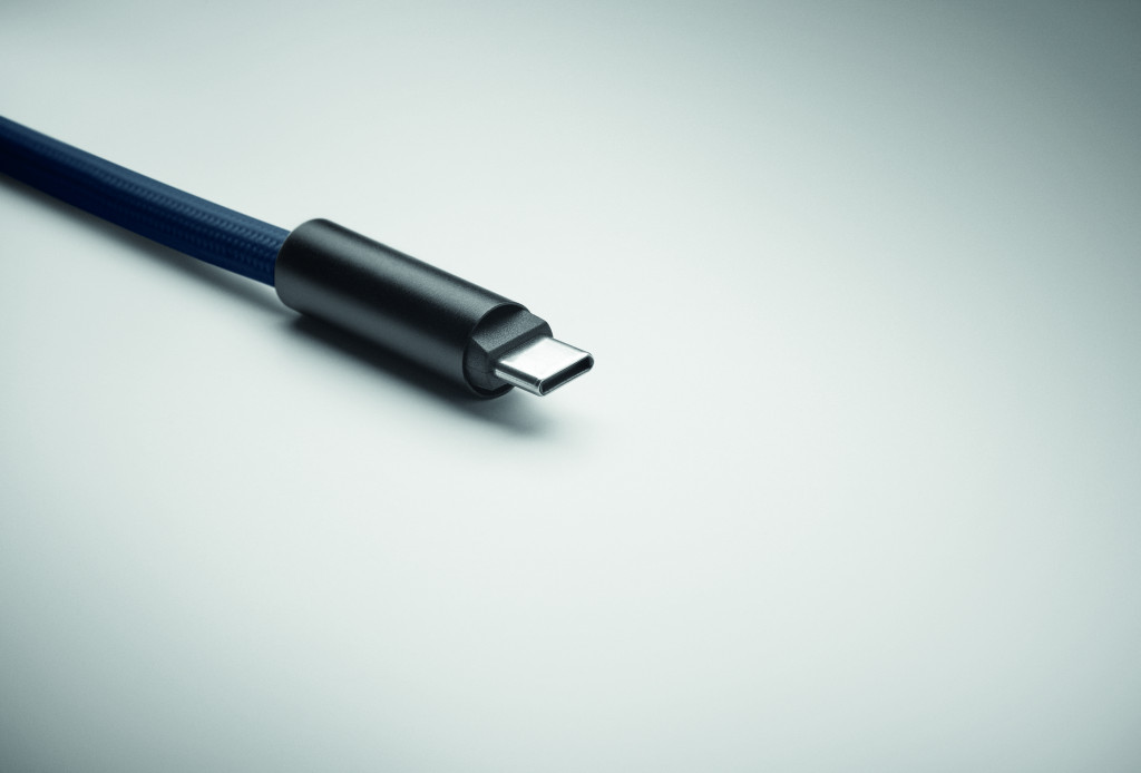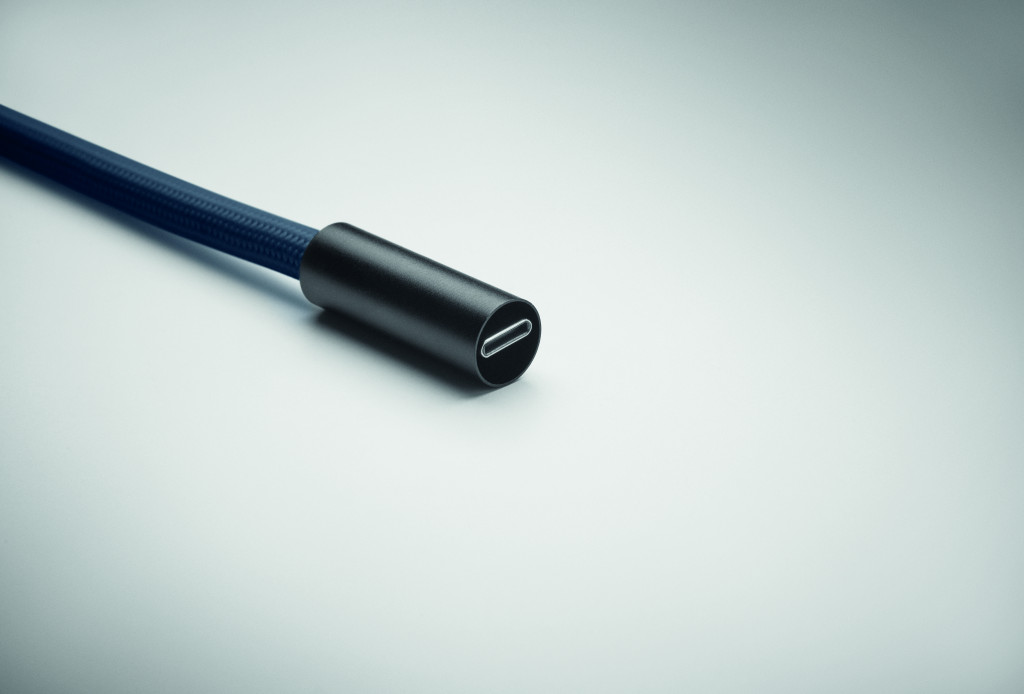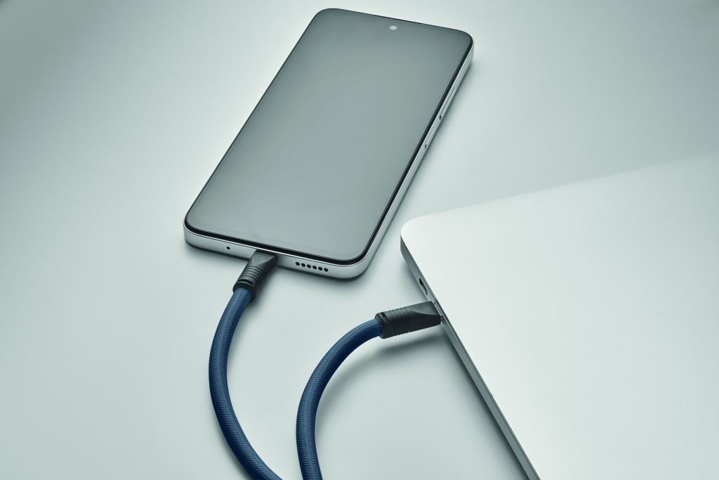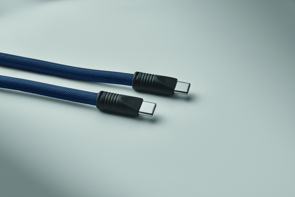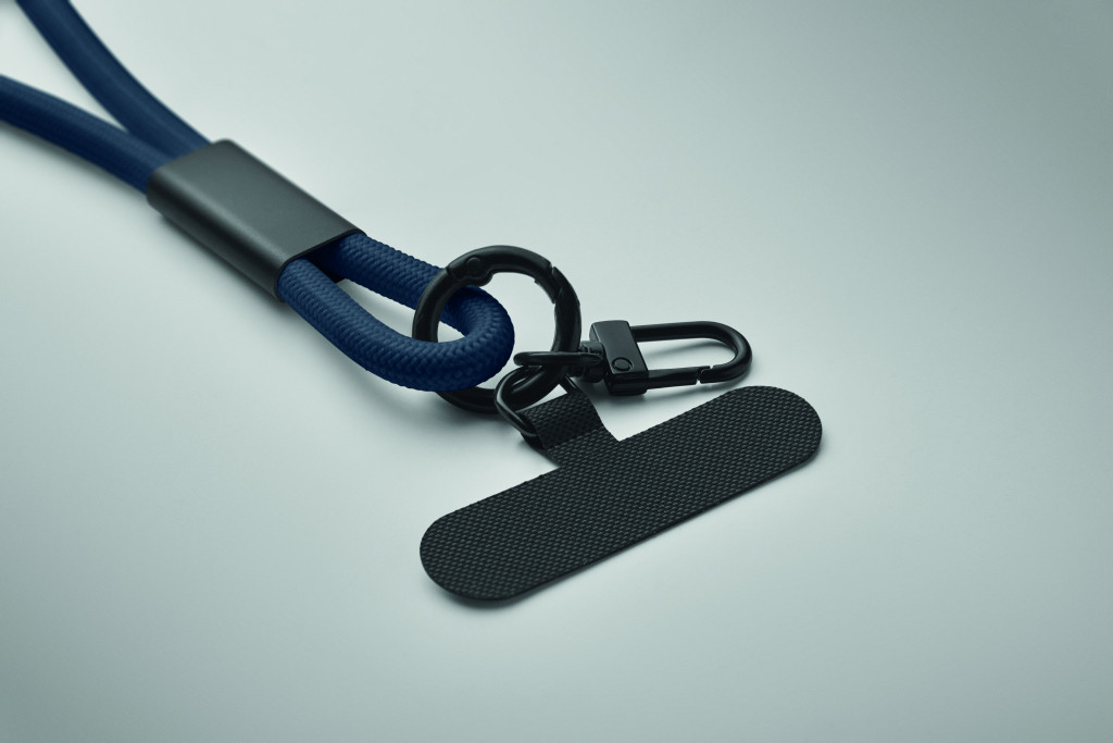 Zsinóros, 60 W-os, C-típusról C-típusúra töltő- és adatátviteli kábel RPET-ből, telefon- és kulcstartóval.