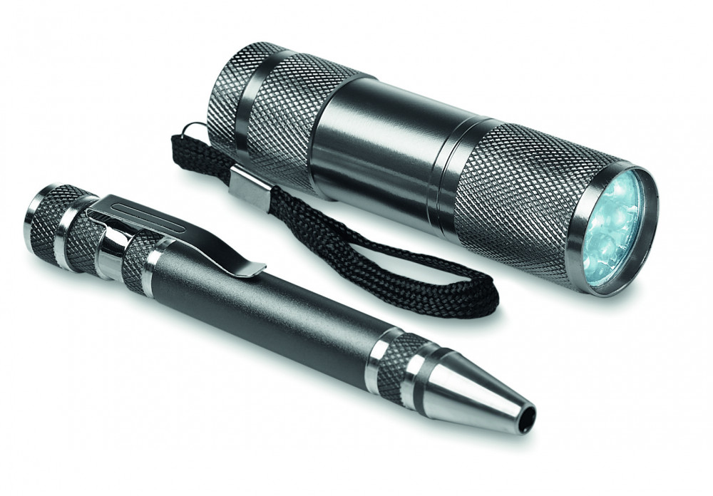 Szerszámkészlet dobozban. 9 LED-es alumínium zseblámpa és egy többfunkciós, alumínium, toll alakú szerszám. 3 normál- és 3 Phillips csavarhúzó fej. 3 db AAA elemmel működik, elem nélkül szállítjuk.