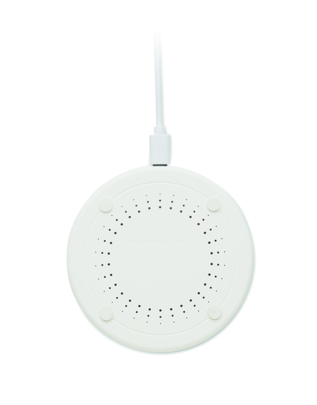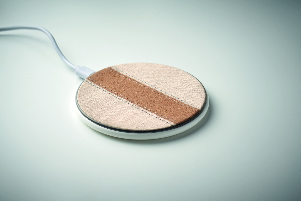Vezeték nélküli töltő újrahasznosított ABS-ből, pamut és parafa részletekkel. Csatlakoztassa a számítógéphez és helyezze rá az okostelefont. Kimenet: DC 9V/1.67A (15W).