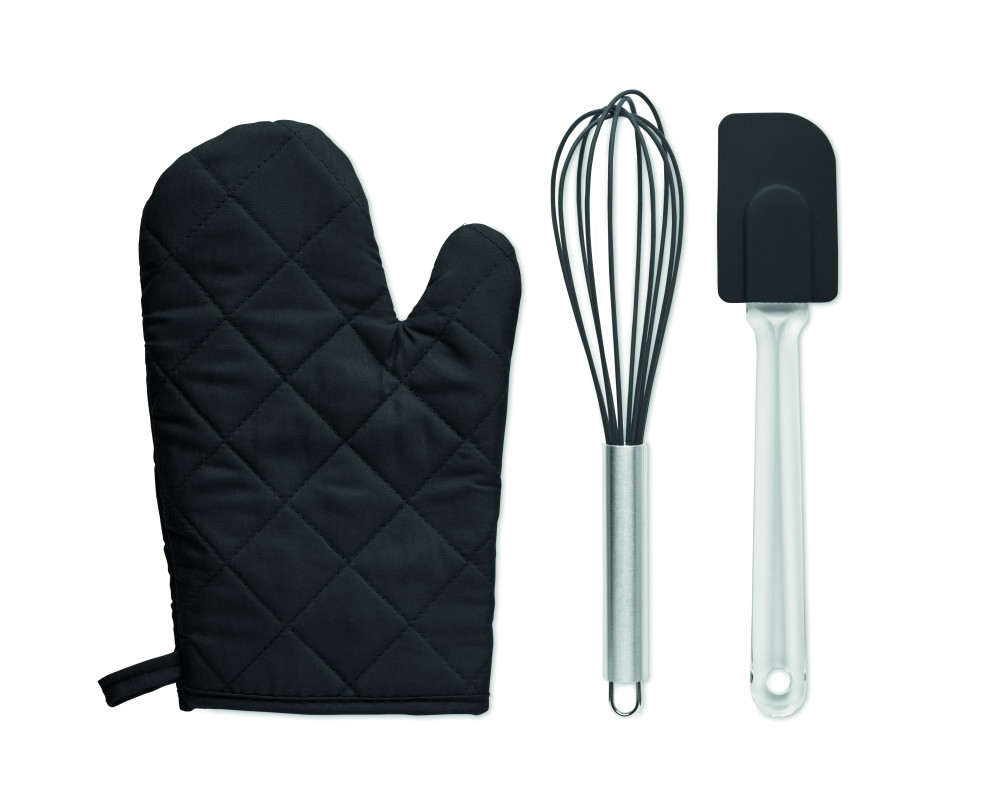 Sütő kellék készlet. Tartalmaz egy 95% poliészter és 5% pamut kevert szálas anyagból készült konyhai edényfogó kesztyűt, kézi habverőt, valamint szilikon spatulát.