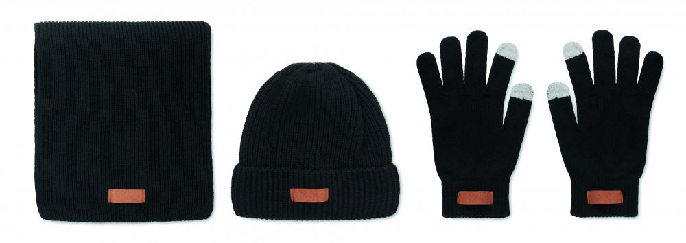 3 darabos téli szett, univerzális méretben. RPET sapkát, sálat és érintőkesztyűt tartalmaz, mindegyiken emblémázható címkével.
