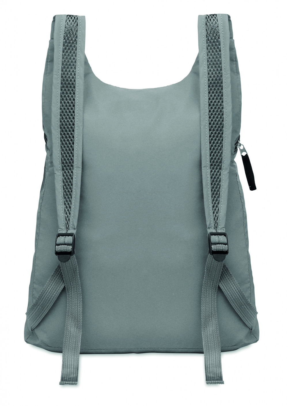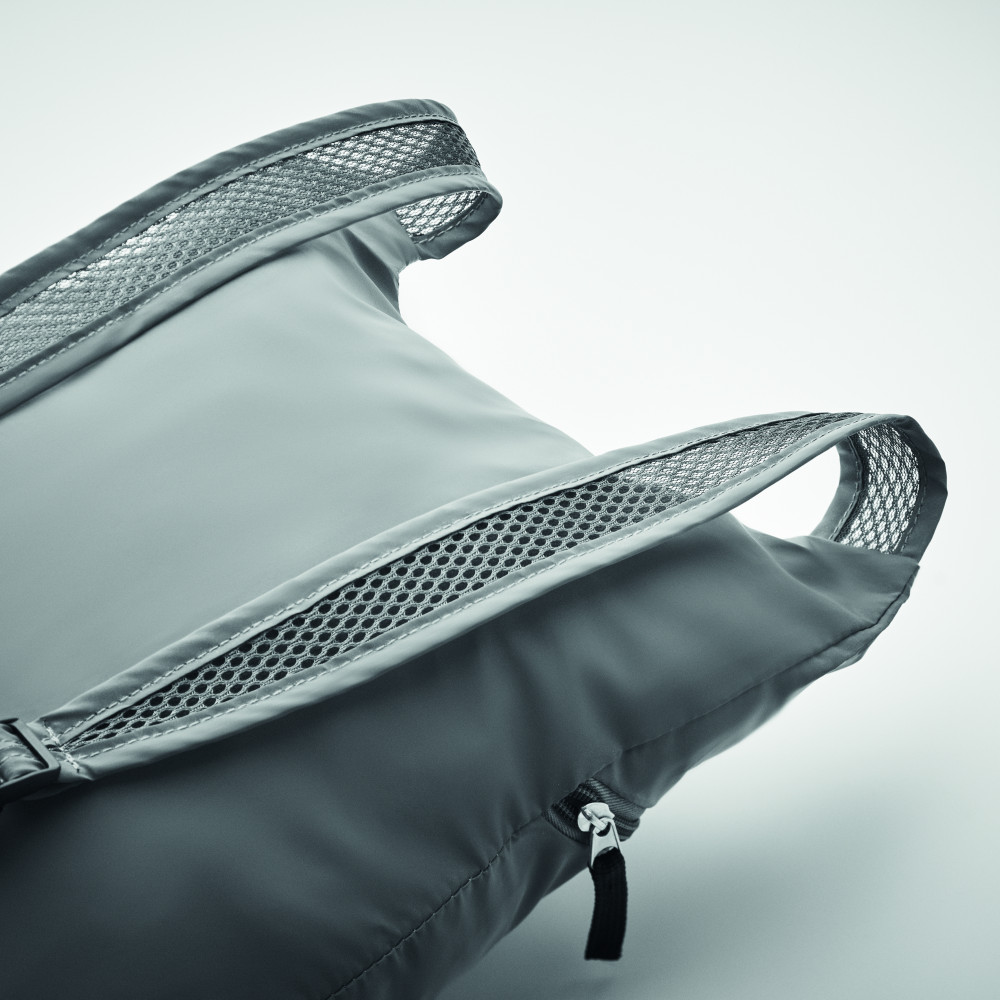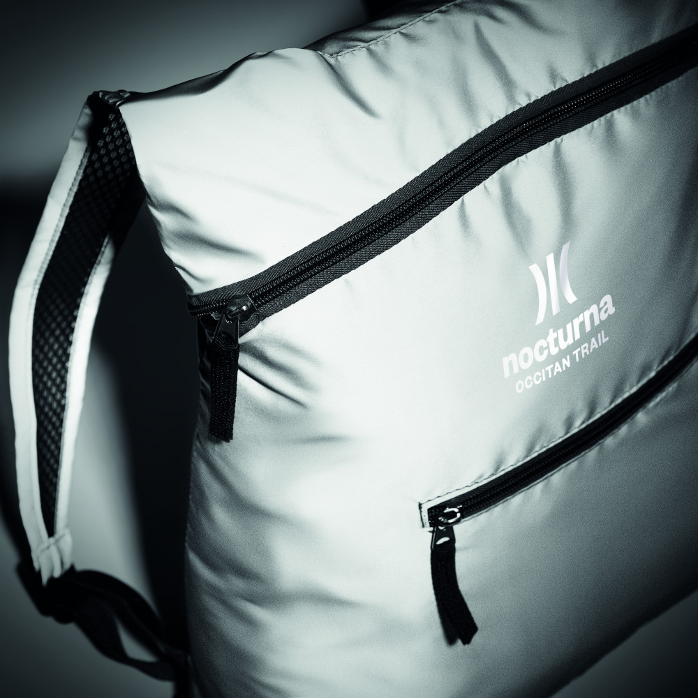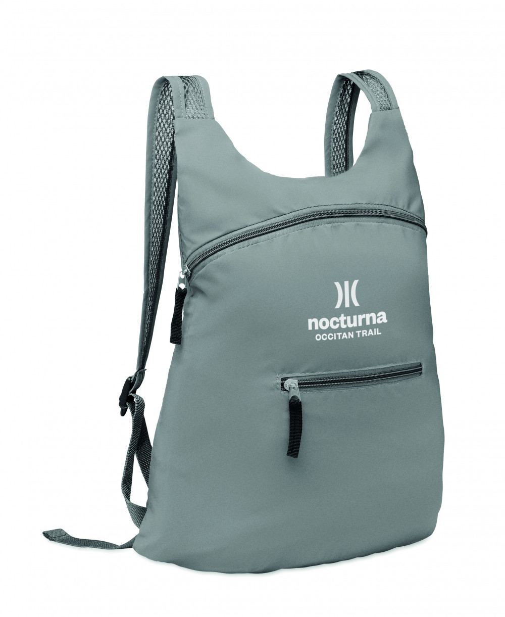 Összehajtható sport hátizsák magas fényvisszaverő képességű 190T poliészterből, cipzáras elülső zsebbel, állítható vállpántokkal.