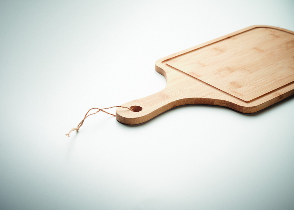 Természetes formájú tálalódeszka bambuszból, vájattal és juta kötéllel. A bambusz természetes anyag, színében, mintázatában és méretében esetenként eltérő lehet.