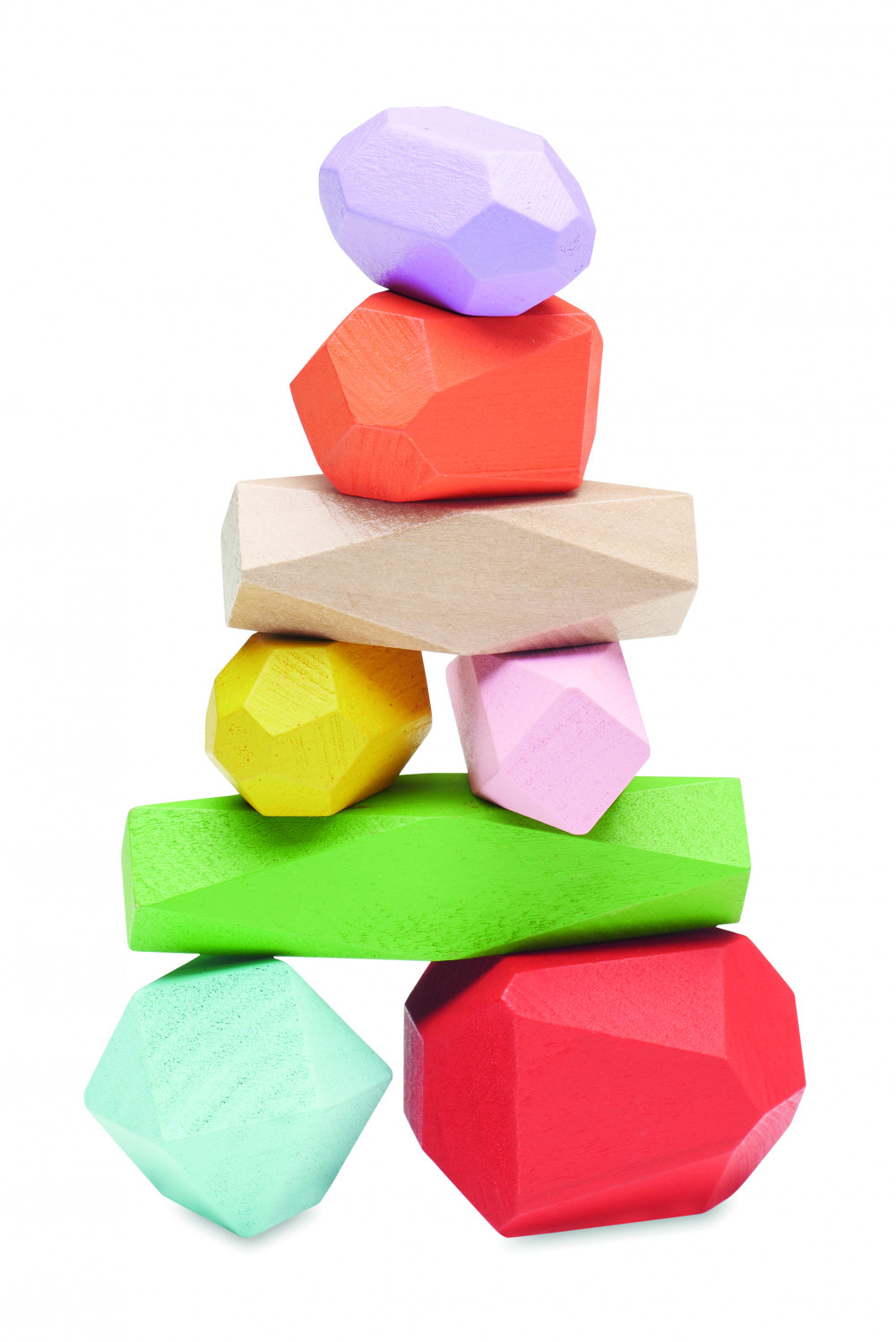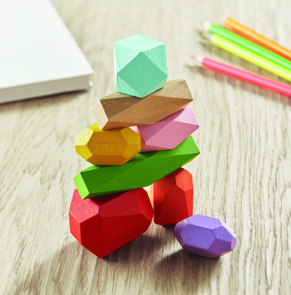 8 részes, színes, fából készült, kő formájú építőjáték, pamut húzózsinóros tárolótasakban.