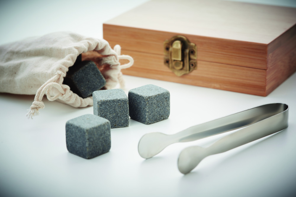 Italhűtő szett bambusz ajándékdobozban. 9 db többször használható kő kockát, pamut tárolózsákot, csipeszt tartalmaz. A bambusz természetes anyag, termékenként szín- és méretbeli eltérések jelentkezhetnek, ami befolyásolhatja a dekoráció végső eredményét.