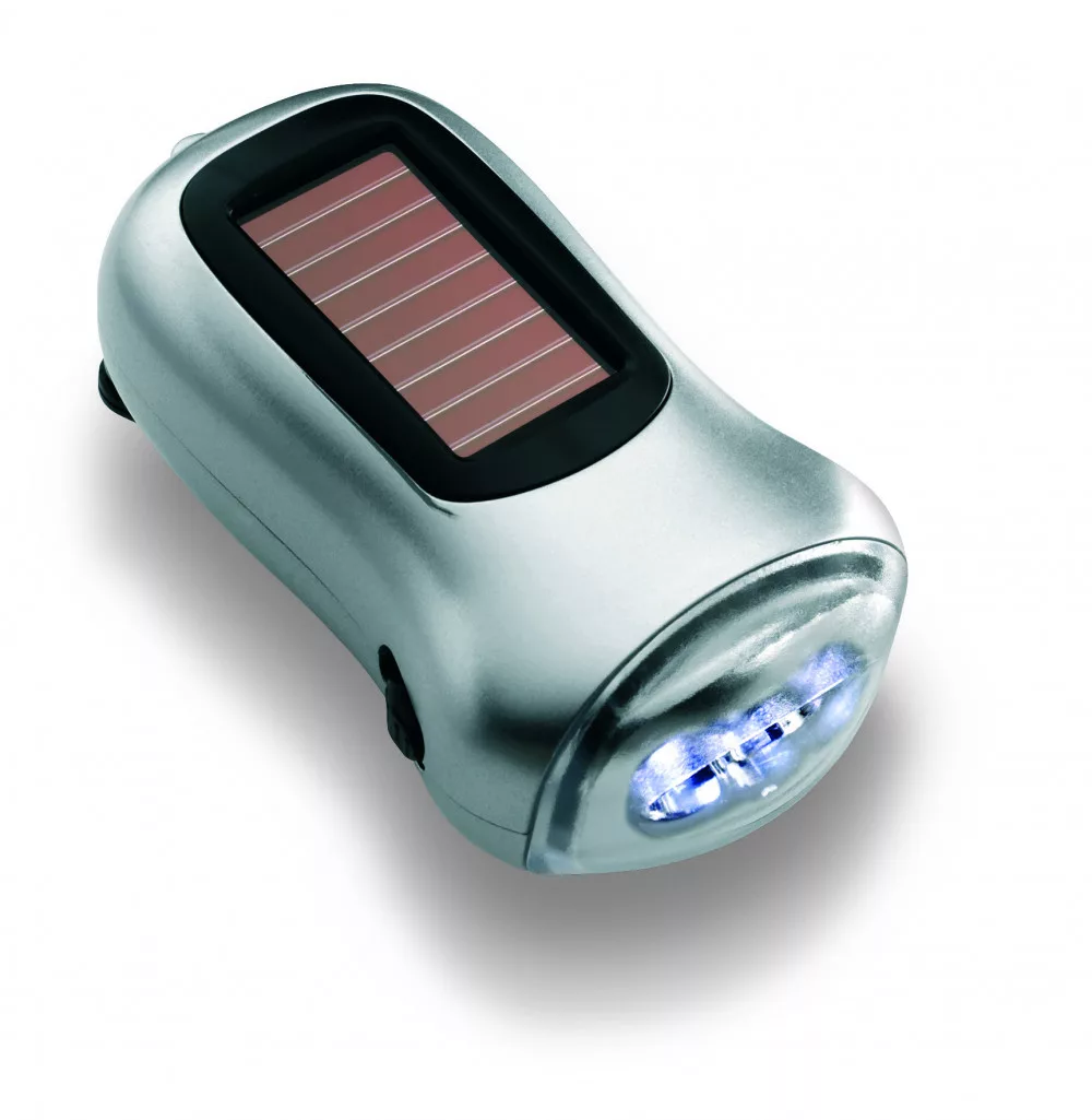 Környezetkímélő napelemmel és dinamóval is működő elemlámpa. ABS burkolatban, szaténezüst színben.