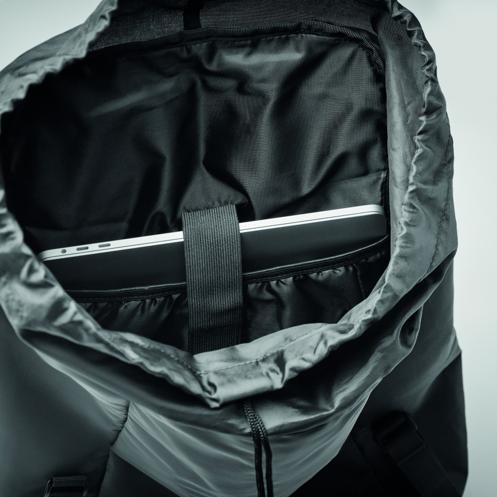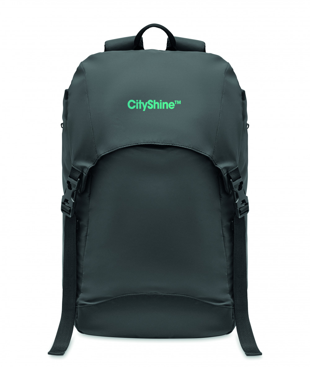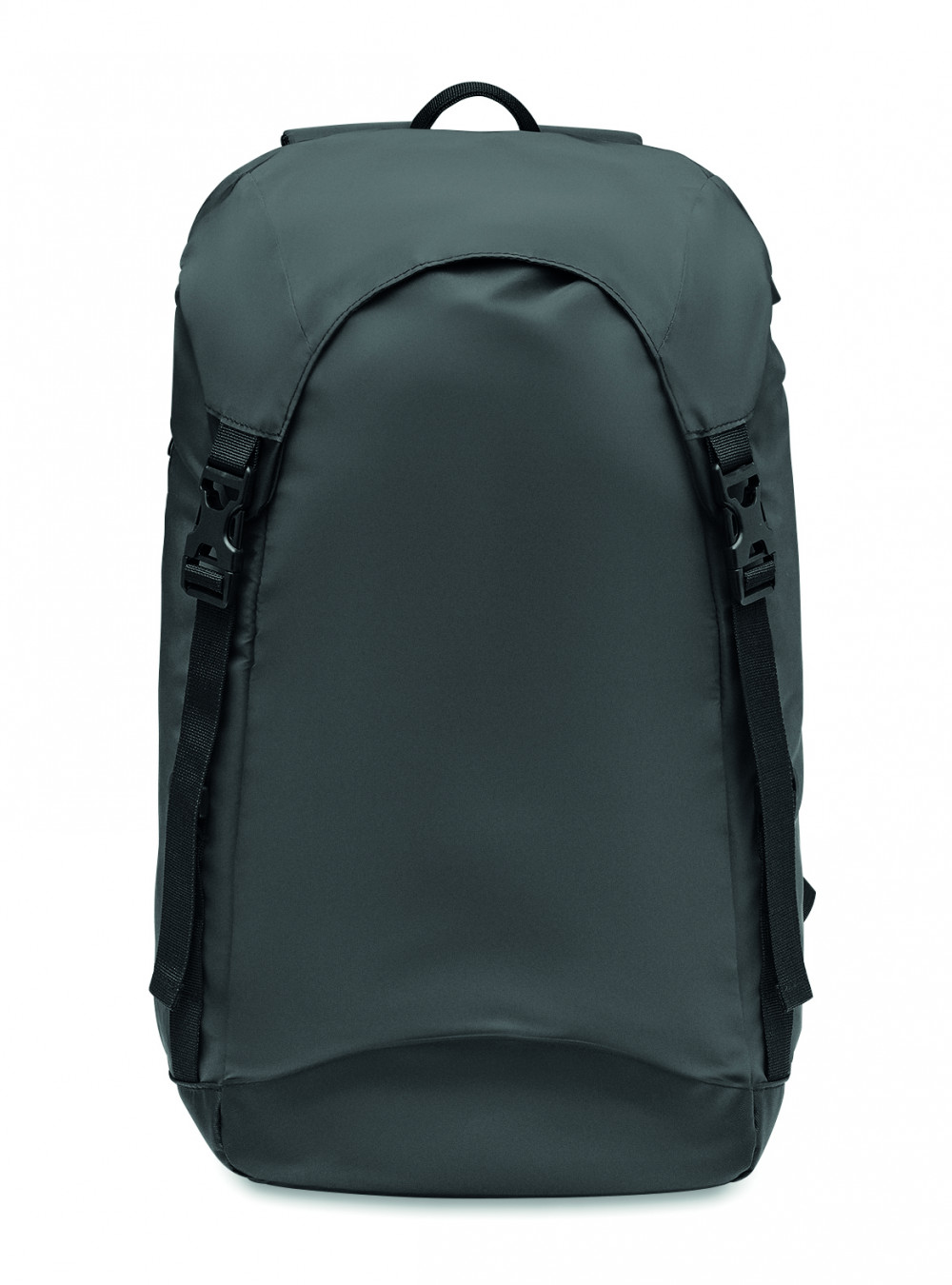Fényvisszaverő granulátummal bevont 190T poliészterből készült túra hátizsák. Cipzáras külső oldalzseb és párnázott hátrész, húzózsinórral zárható belső rész. Egy nagy, párnázott belső laptoprekesz. Állítható, párnázott vállpántok, állítható mell- és hashevederek csatos záródással. Vízlepergető.