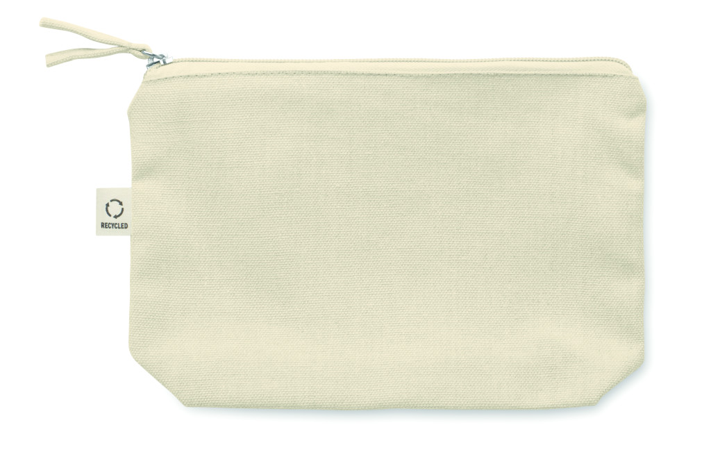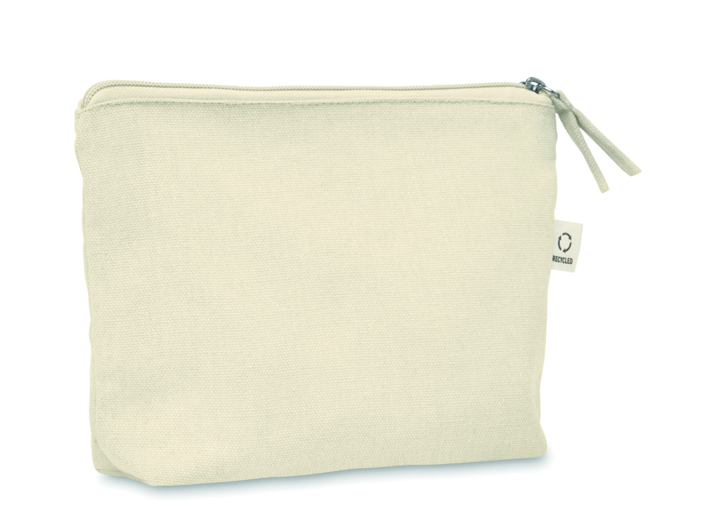 Újrahasznosított anyagból készült kozmetikai- vagy piperetáska (70% újrahasznosított pamut és 30% RPET poliészter), színazonos cipzárhúzóval. 320 g/m². Ez az anyag nyomtatás után zsugorodhat.