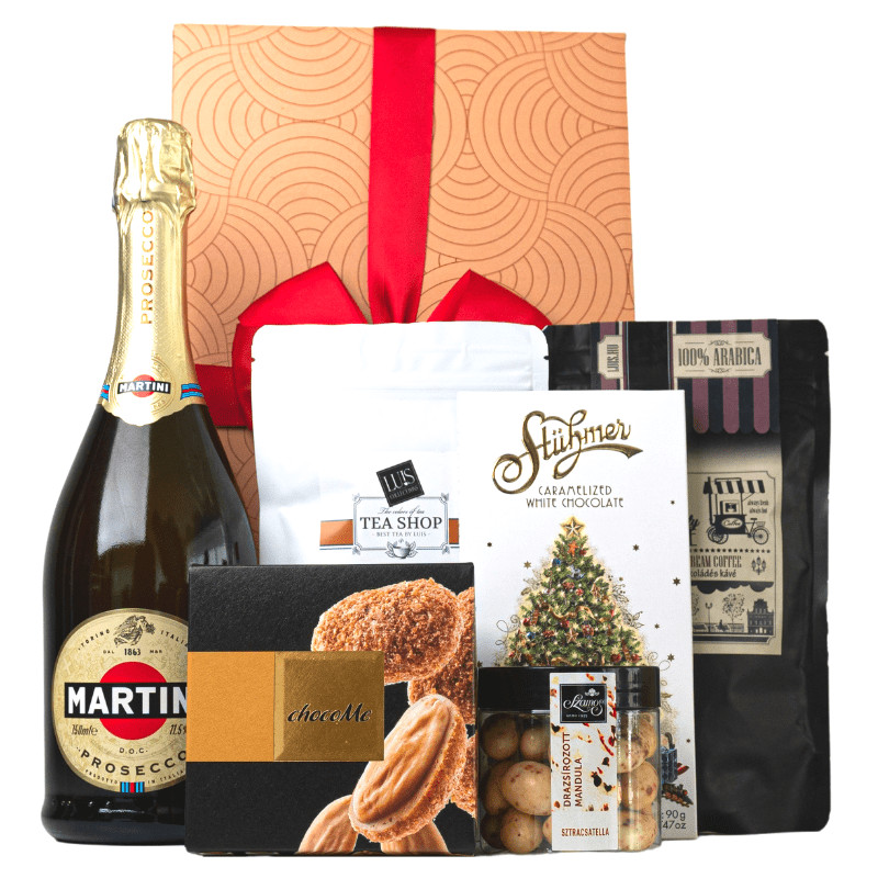 Ebben a prémium díszdobozban, melyet finom selyem szalaggal átkötve szállítunk, igazi kulináris kincsek várják a felfedezőt: egy pezsgő Martini Prosecco, a Chocome Guérande sós csokoládés mandula ostyája, egyedülálló csokoládé ízű kávé, és még sok más ízletes prémium finomság.