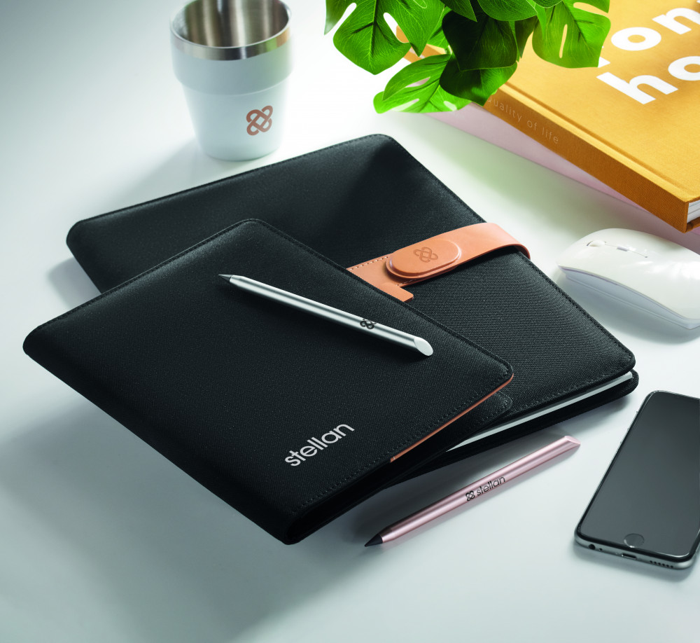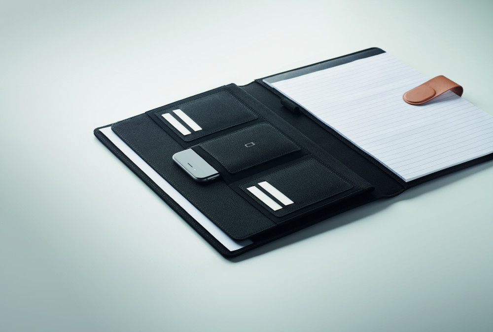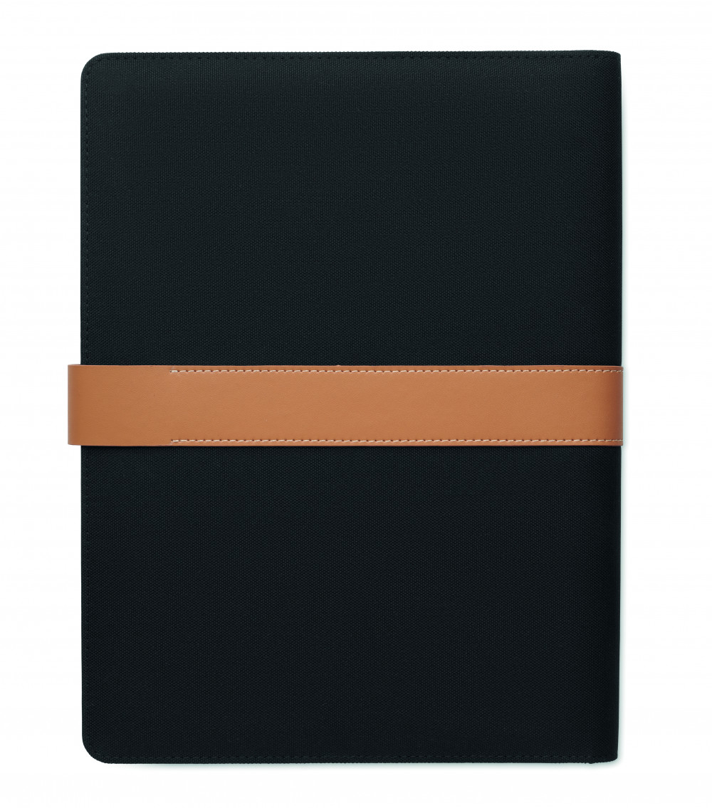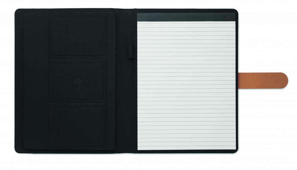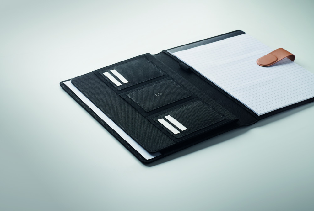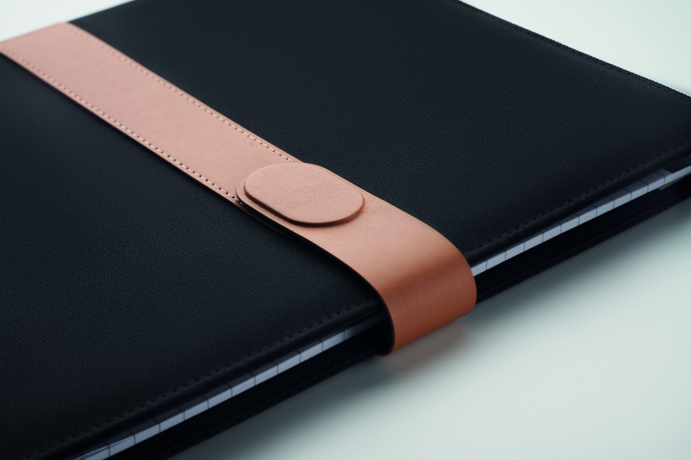 A4 iratmappa RPET anyagból, műbőr részletekkel. Cserélhető A4 jegyzettömb. 30 vonalas oldal újrahasznosított papírból. Tolltartó. 4 kártyatartó, 3 kis zseb és egy nagy rekesz. Mágneses pántos záródással. FSC®-certified | FSC MIX , P8.6, FSC-C213206