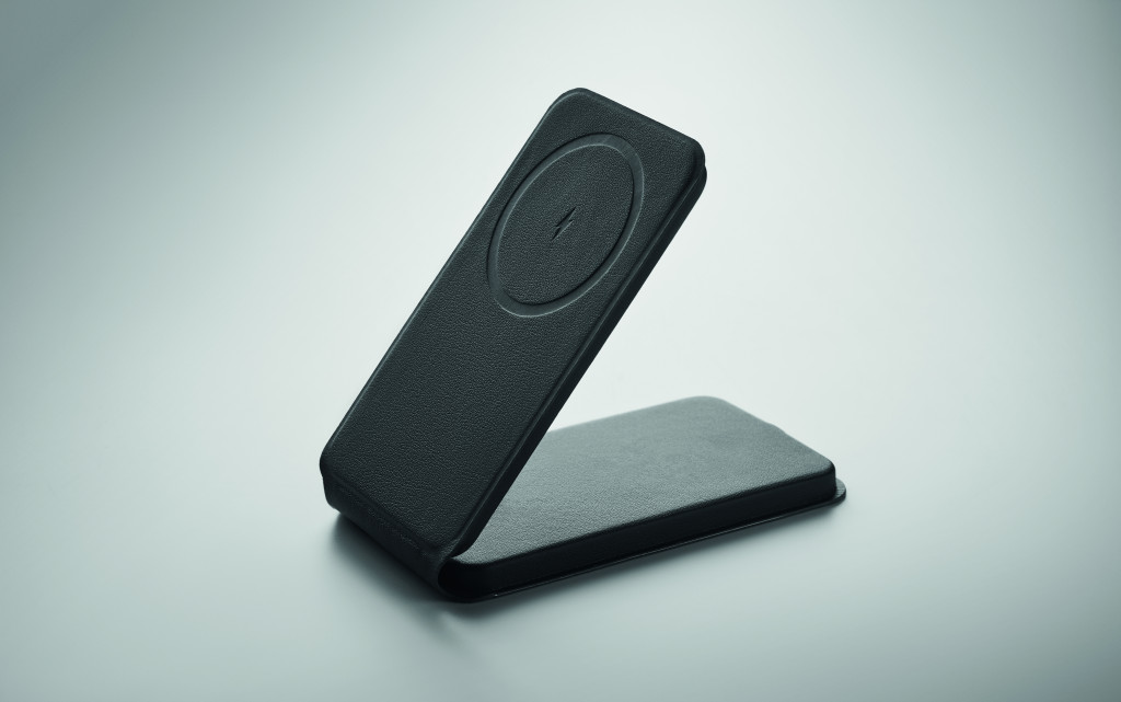Összecsukható 15W vezeték nélküli töltő mágneses telefonállvánnyal, 58% újrahasznosított poliészterből és 42% PU-ból.