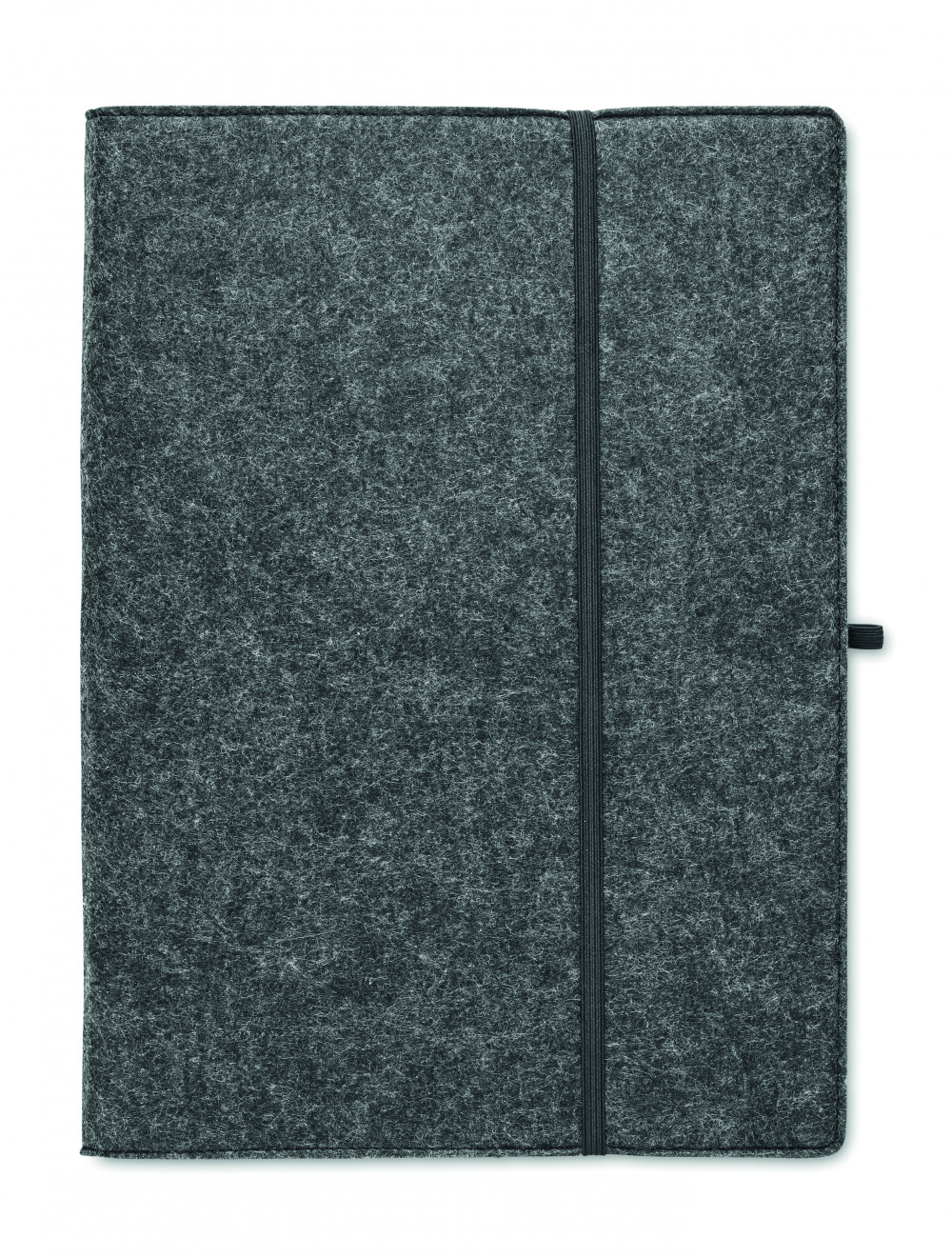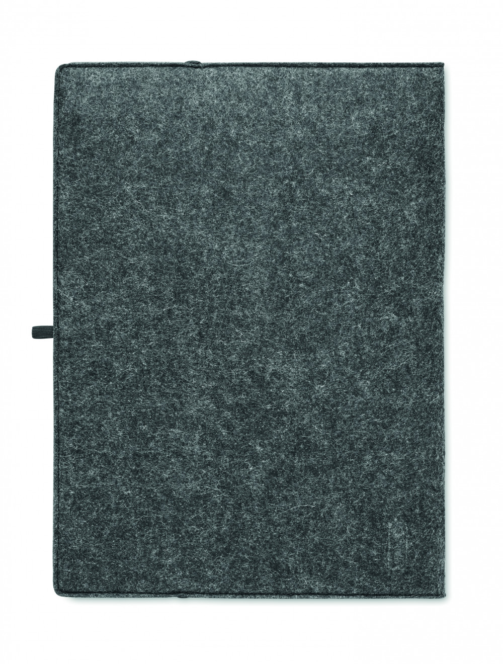 A4 konferencia mappa RPET filcből. 100 lapos, vonalas, újrahasznosított papírból készült jegyzettömbbel, rugalmas tolltartó hurokkal.