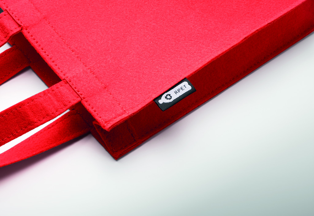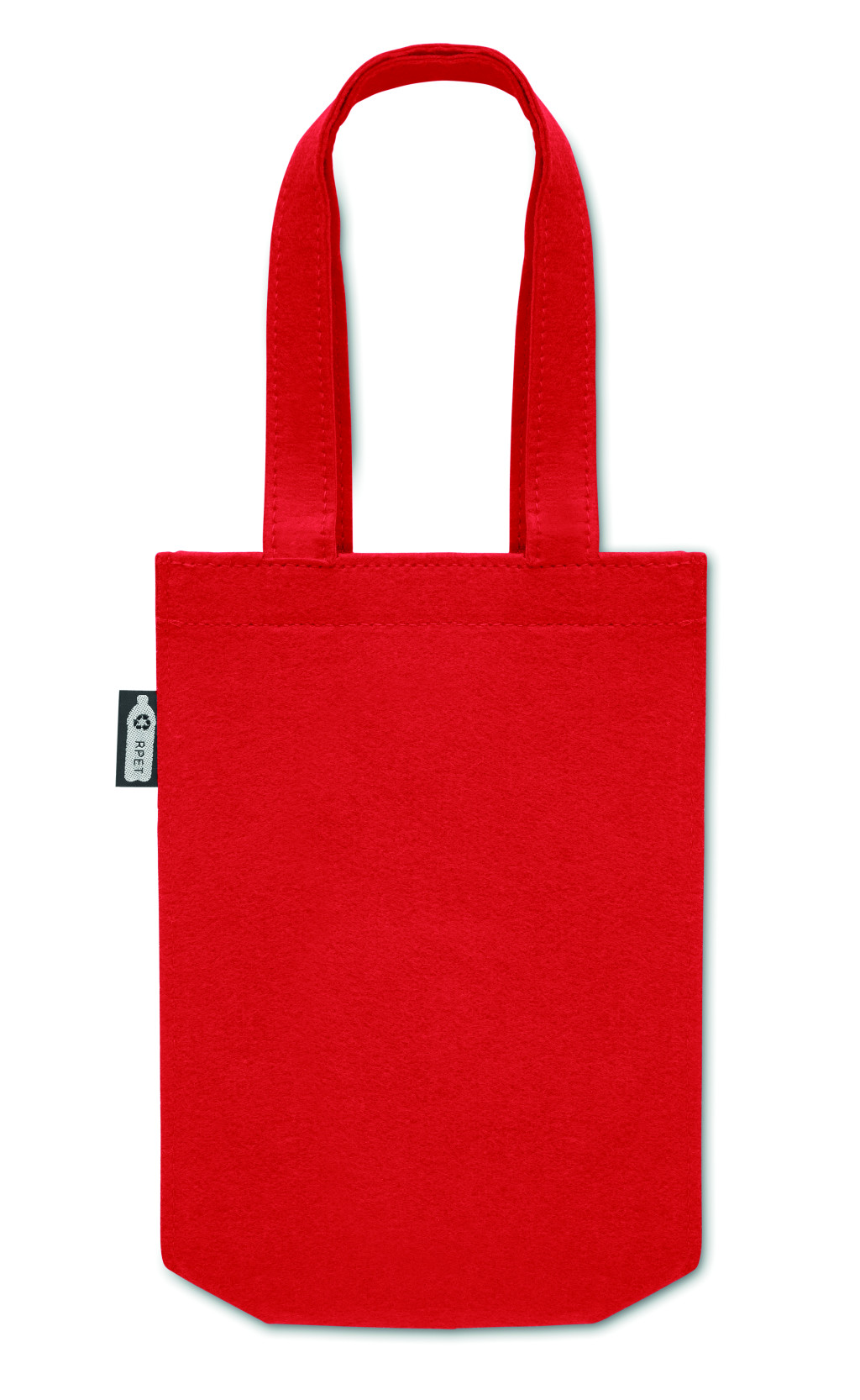 Kis, RPET filcből készült ajándéktáska rövid fülekkel, az alján toldással. Anyagvastagság: 1 mm.