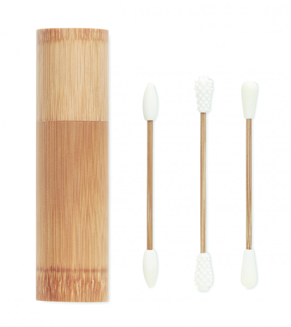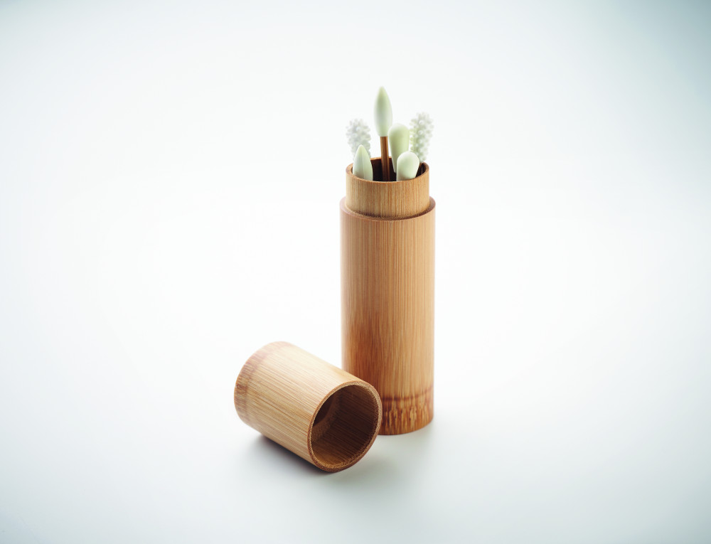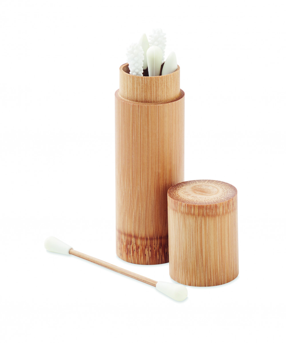 6 db többször felhasználható, bambuszból készült tisztítópálcika, mindkét végén szilikon fejjel, ápolási célokra, bambusz dobozban. A bambusz természetes anyag, színében, mintázatában és méretében esetenként eltérő lehet.
