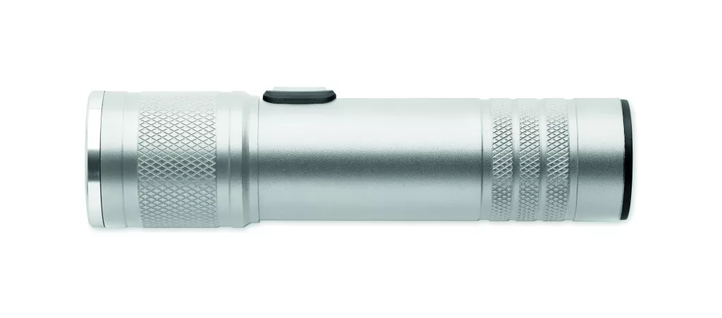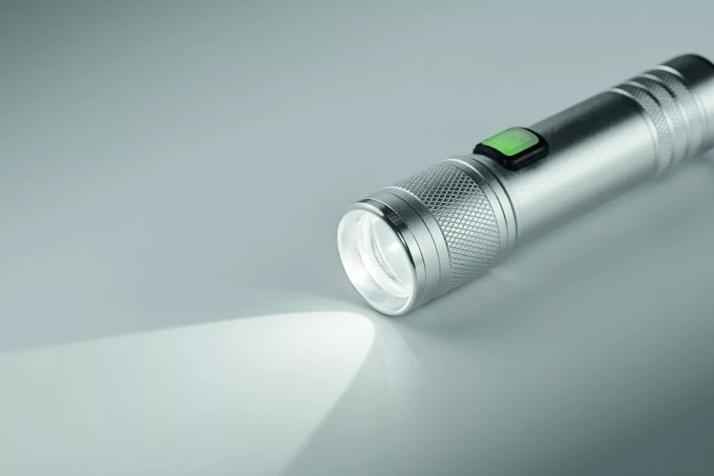 Újratölthető COB zseblámpa újrahasznosított alumíniumból. 100 lumen fényerővel, 3 fénybeállítással és fókuszálási funkcióval. Beépített 800 mAh újratölthető akkumulátor. Töltőkábellel.