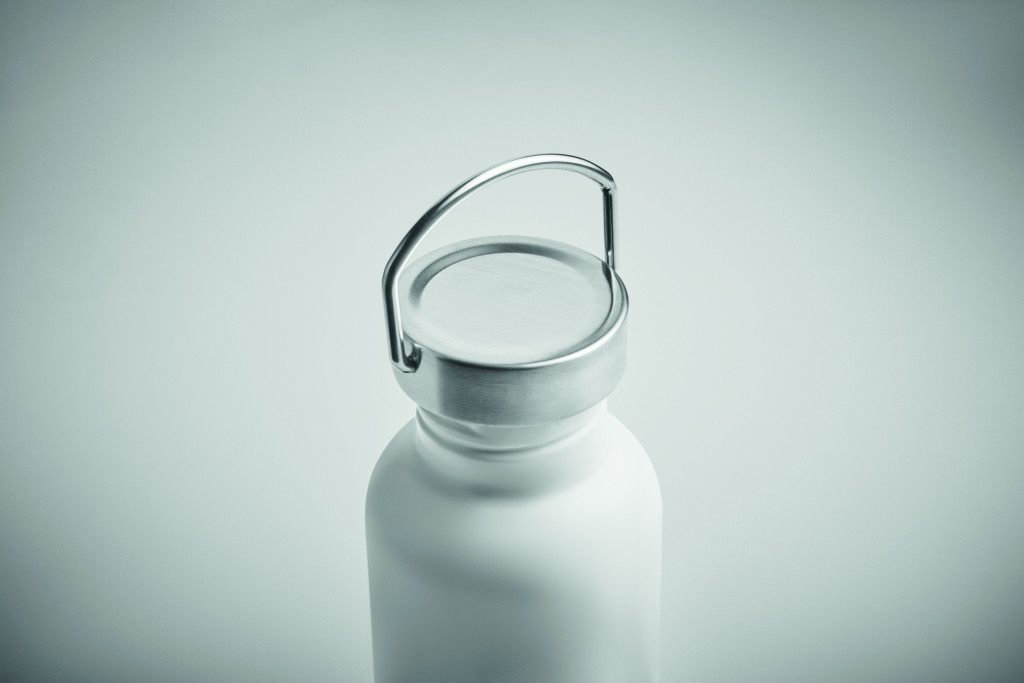 Szimplafalú palack újrahasznosított rozsdamentes acélból (90% újrahasznosított rozsdamentes acél és 10% rozsdamentes acél), fedéllel és fogantyúval. Szivárgásmentes. Űrtartalom: 500 ml. Mivel ez egy szimplafalú bögre, hőátadás lehetséges.
