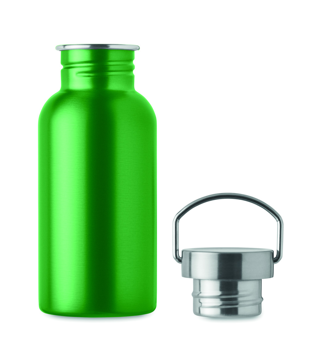 Szimplafalú palack újrahasznosított rozsdamentes acélból (90% újrahasznosított rozsdamentes acél és 10% rozsdamentes acél), fedéllel és fogantyúval. Szivárgásmentes. Űrtartalom: 500 ml. Mivel ez egy szimplafalú bögre, hőátadás lehetséges.