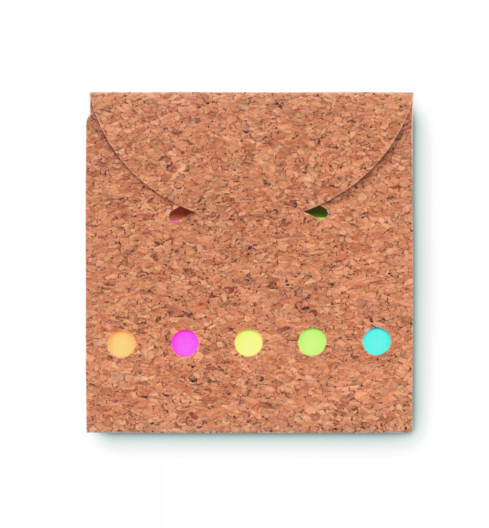 Öntapadós jegyzetelő szett boríték jellegű parafa borítóval. 125 lapos nagyméretű sárga öntapadós jegyzettömb és 25 lapos, 5 különböző színű lapjelző. A parafa 100%-ban természetes anyag. Szerkezeti jellege és felületi porozitása miatt az egyes tárgyak végső emblémázási eredménye eltéréseket mutathat.