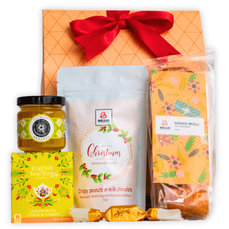 Tökéletes választás egy meghitt, otthoni, kandalló melletti pihenéshez! A "Fireside Gatherings" ajándékcsomag a finomságok tökéletes harmóniáját kínálja: ropogós földimogyoró étcsokoládéban, kézműves mákos bejgli, hazai akácméz, és egy nyugtató citromfű tea gyömbérrel. És ha mindez nem lenne elég, a csomagban lapul egy édes szaloncukor is, ami az ünnepi hangulatot hozza el! Ideális választás szeretteidnek, hogy megédesítsd az együtt töltött pillanatokat.