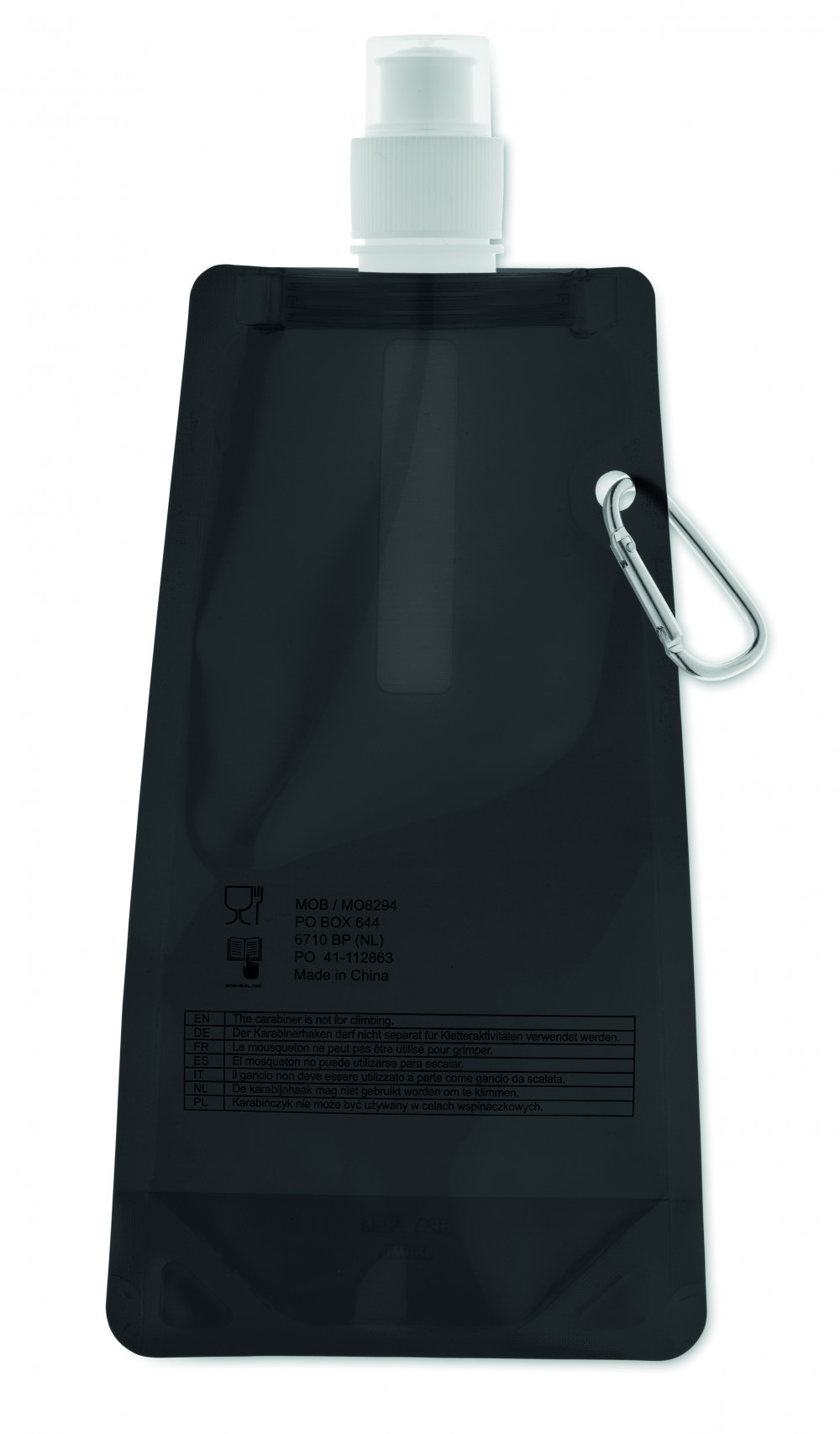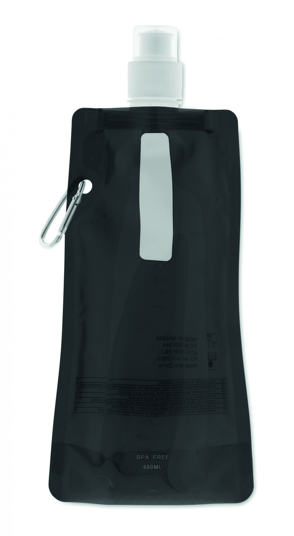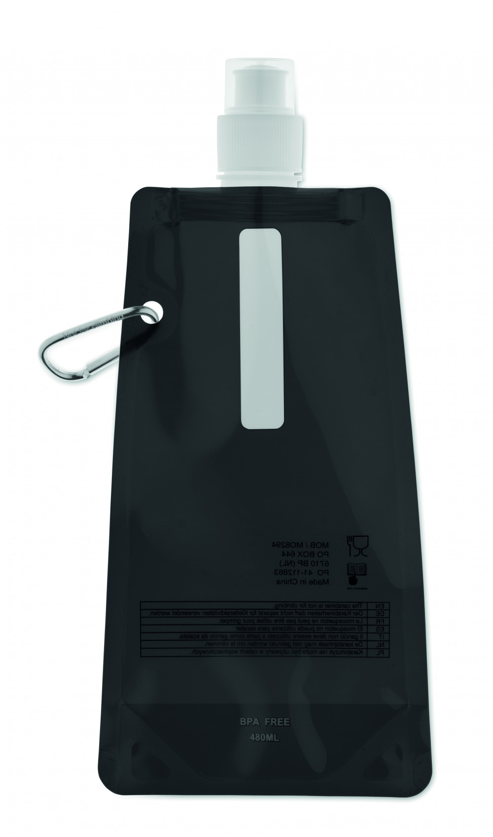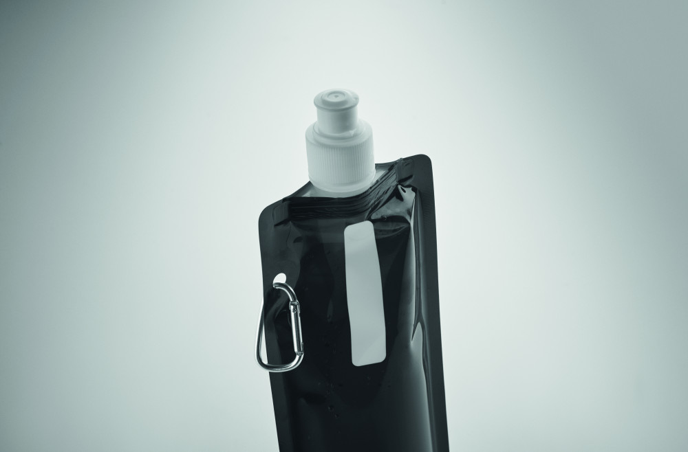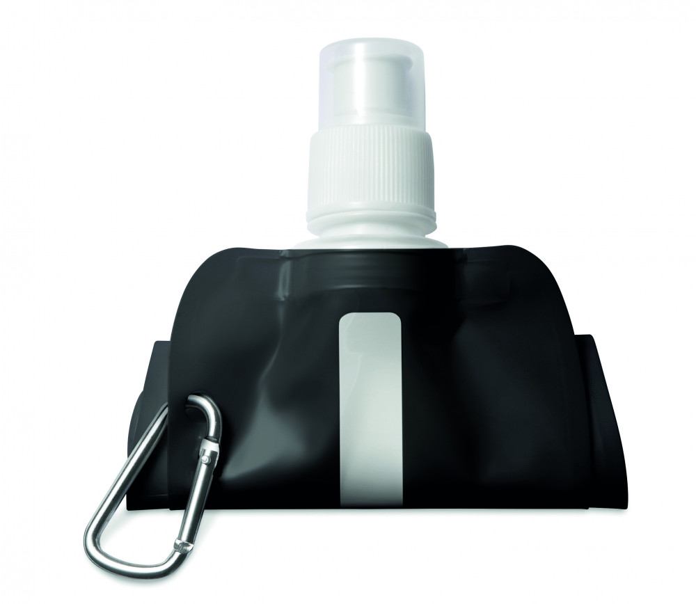 Összehajtható vizes palack BPA-mentes PET műanyagból. Alumínium karabinerrel. Űrtartalom: 480 ml. Szivárgásmentes.