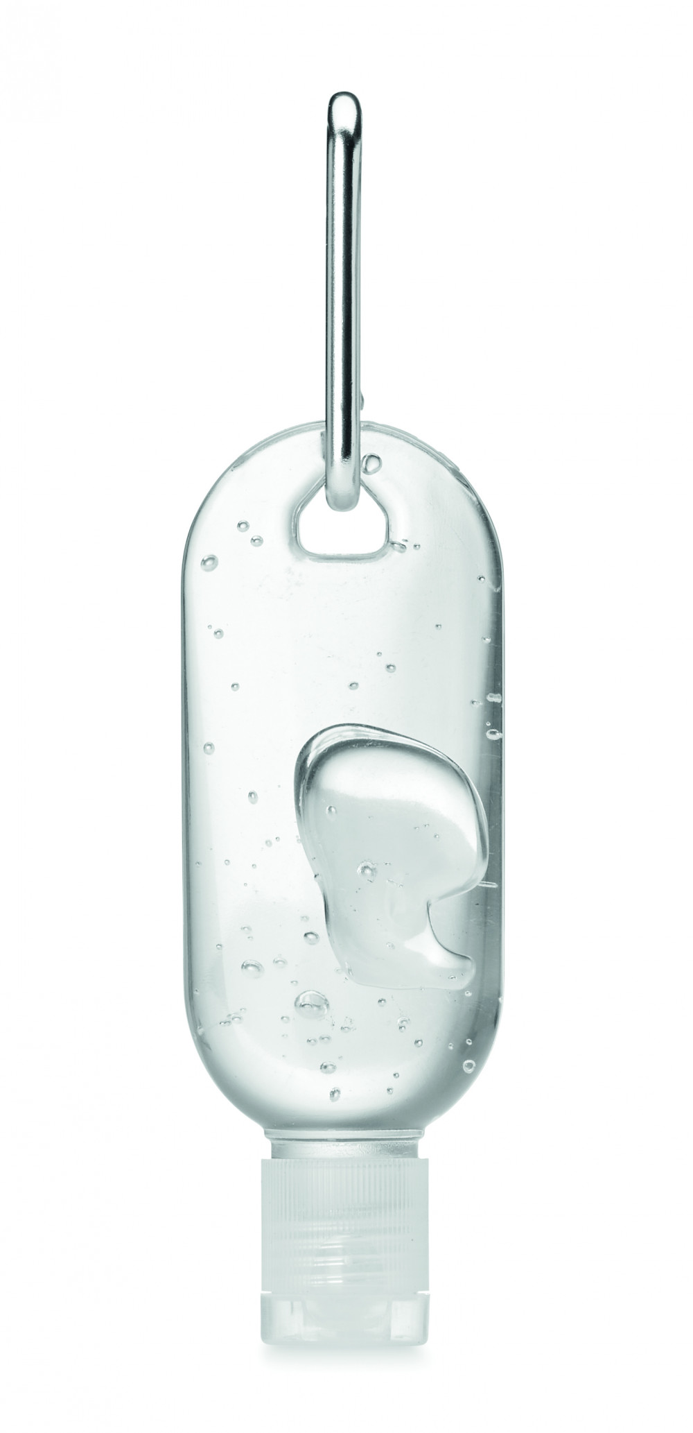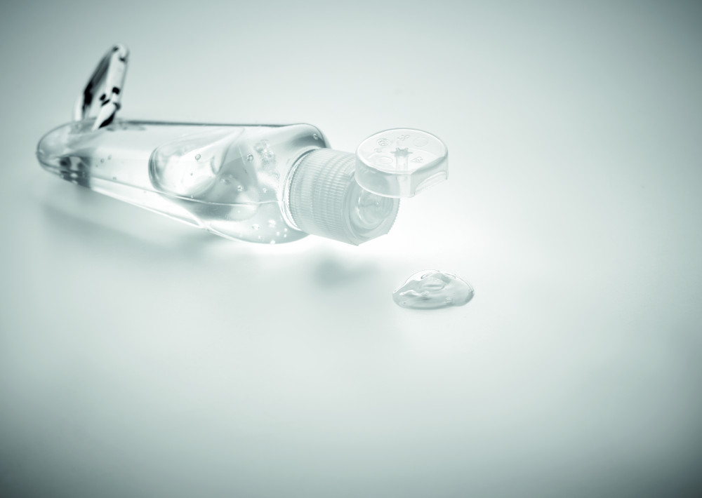 Kéztisztító gél flip top (ráütős) kupakos, újratölthető PET flakonban, karabinerrel. Űrtartalom 30 ml.