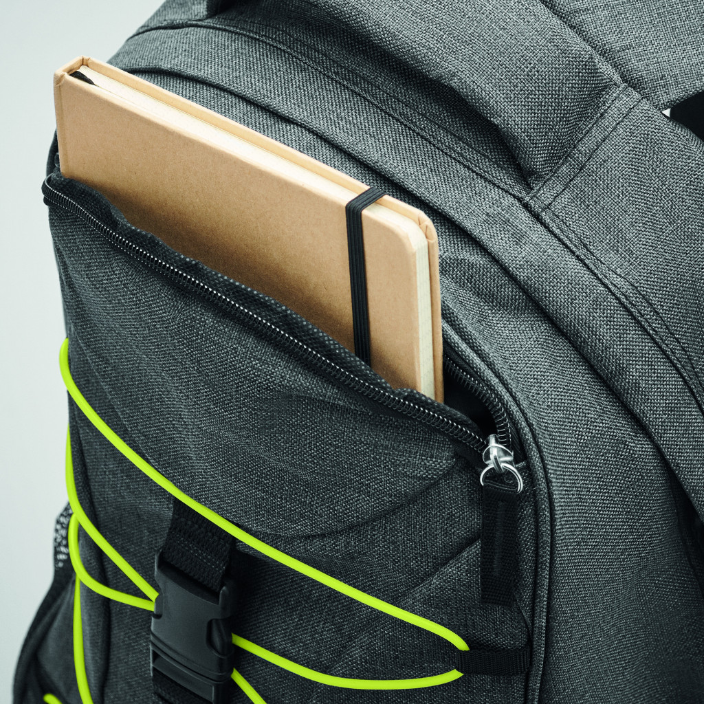 600D melírozott poliészter hátizsák színes kontrasztos elemekkel, az elején sötétben világító zsinórral. Mindkét oldalán hálós zsebekkel.