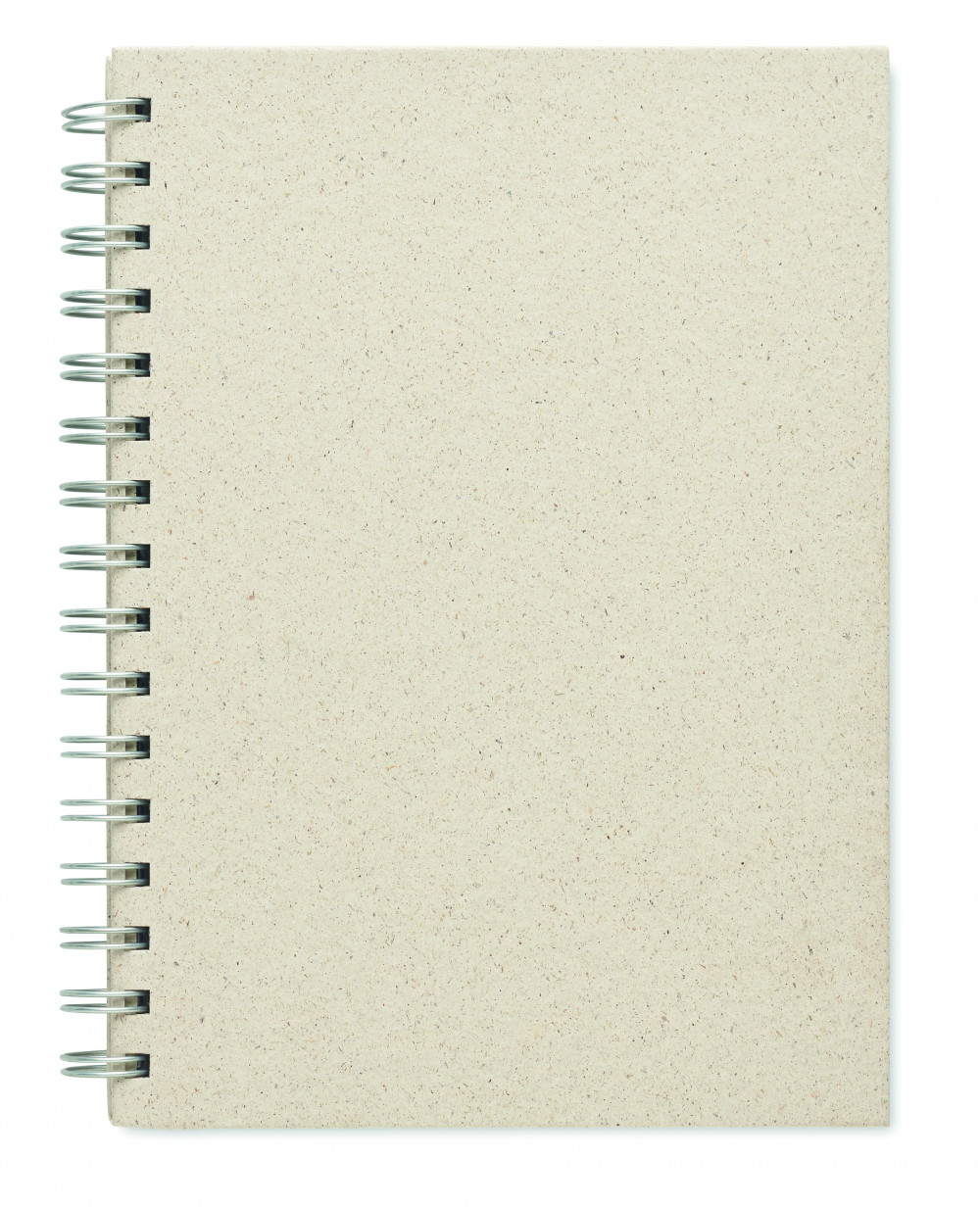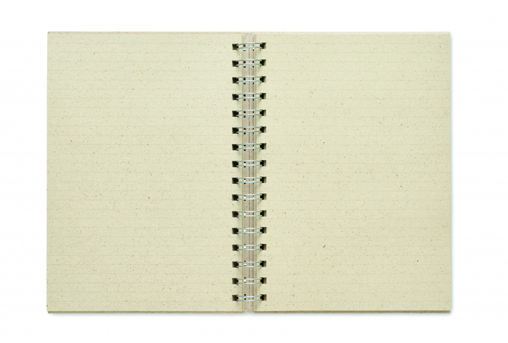 A5-ös spirálos jegyzetfüzet 80 vonalas fűpapír lappal és karton borítóval. Kényelmes és praktikus az irodai megbeszélések vagy iskolai jegyzetek leírásához. A fűpapír tökéletes tudatos promóciós reklámajándék. Az előállítási folyamat az elejétől a végéig fenntartható és környezetbarátabb, mint a hagyományos faalapú papíré. EU-ban gyártva.