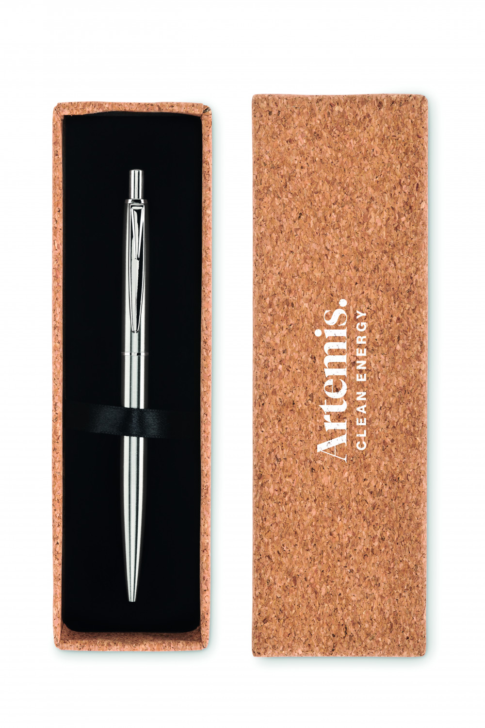Nyomógombos golyóstoll újrahasznosított rozsdamentes acél tolltesttel. Parafa ajándékdobozban. Kéken író betéttel. A parafa 100%-ban természetes anyag. Szerkezeti jellege és felületi porozitása miatt az egyes tárgyak végső emblémázási eredménye eltéréseket mutathat.