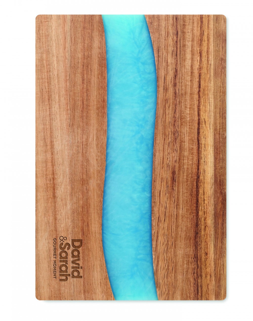 Akáciafa vágódeszka dekoratív epoxigyanta részletekkel. A fa természetes anyag, termékenként szín- és méretbeli eltérések jelentkezhetnek, ami befolyásolhatja a dekoráció végső eredményét.