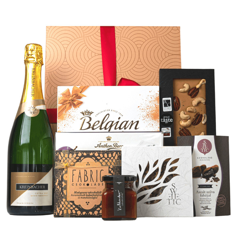 A Kreinbacher Extra Dry Pezsgő azonnal ünnepi hangulatba hoz, míg a kézműves csemegék, mint a magyar tejcsokoládé, az Anthon Berg marcipántallér vagy a tiramisus praliné, az igazi ínyenceknek szólnak. És mindez csak a kezdet! Merülj el a csomag többi ízletes kincsében, és élvezd az ünnepi pillanatok varázsát.