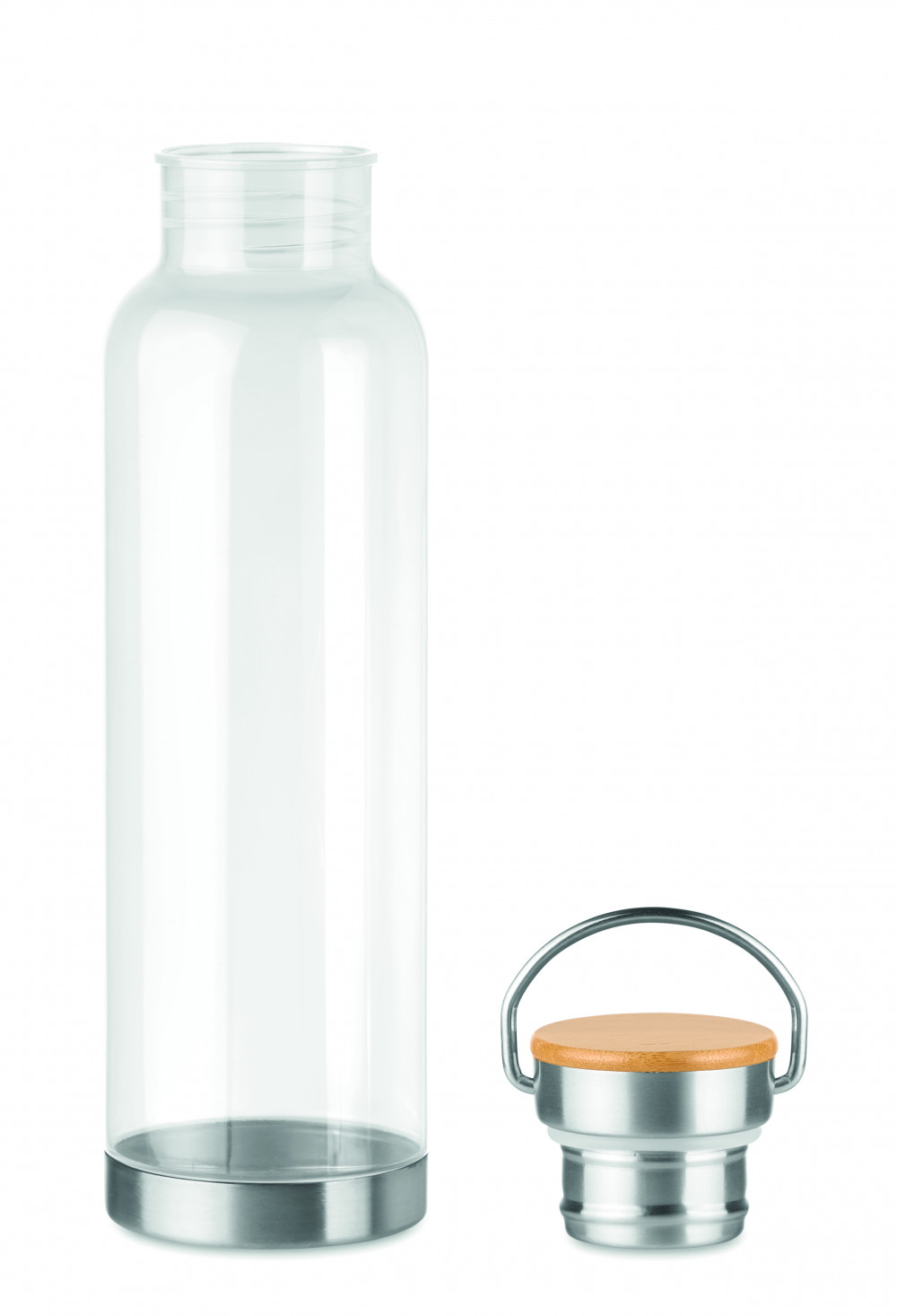 Tritán palack rozsdamentes acél aljjal és bambusz kupakkal. BPA-mentes. Űrtartalom 800 ml. A bambusz természetes anyag, színében, mintázatában és méretében esetenként eltérő lehet. Nem alkalmas szénsavas italokhoz. Szivárgásmentes.