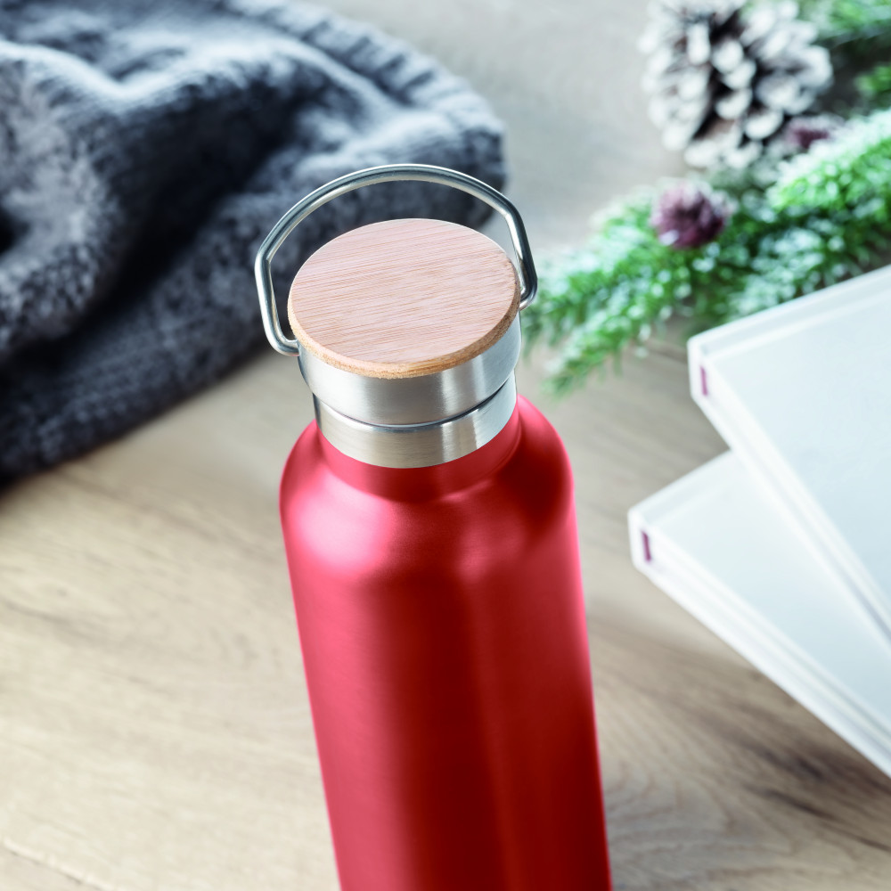 Duplafalú rozsdamentes acél termosz 500 ml űrtartalommal. Fém fogantyús bambusz kupakkal. A szublimációs nyomtatás csak a fehér színű terméken érhető el. Szivárgásmentes. A bambusz természetes anyag, színében, mintázatában és méretében esetenként eltérő lehet.