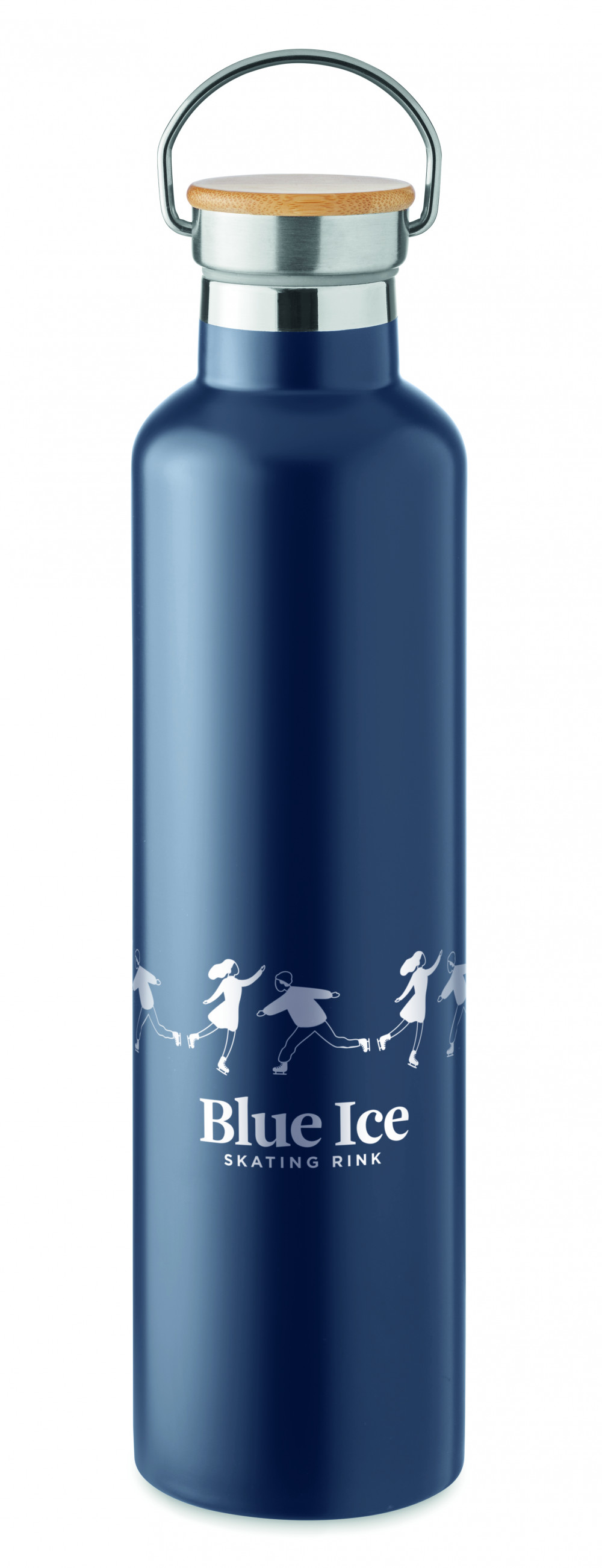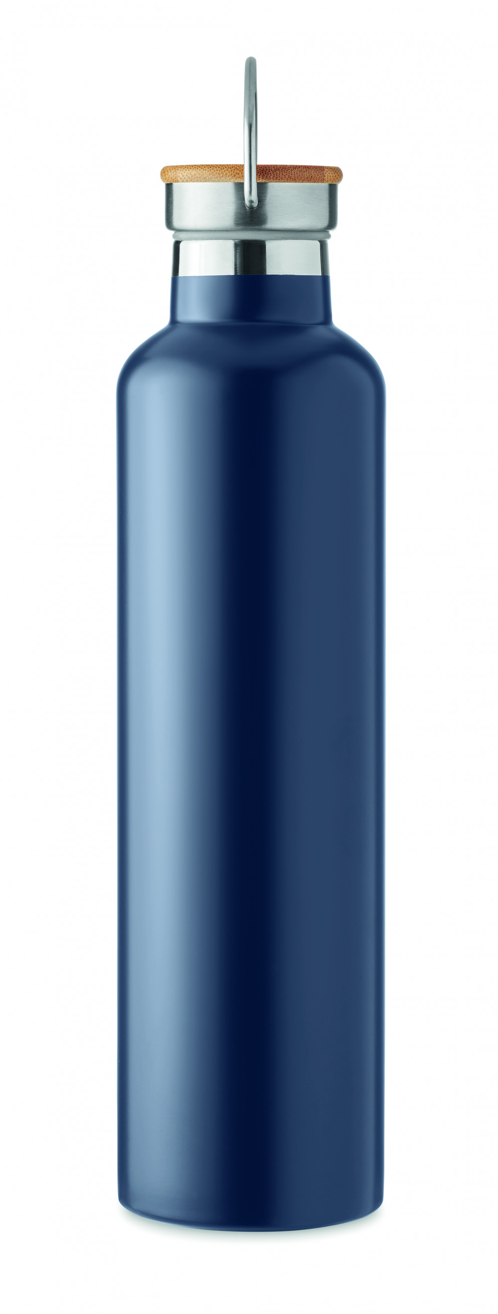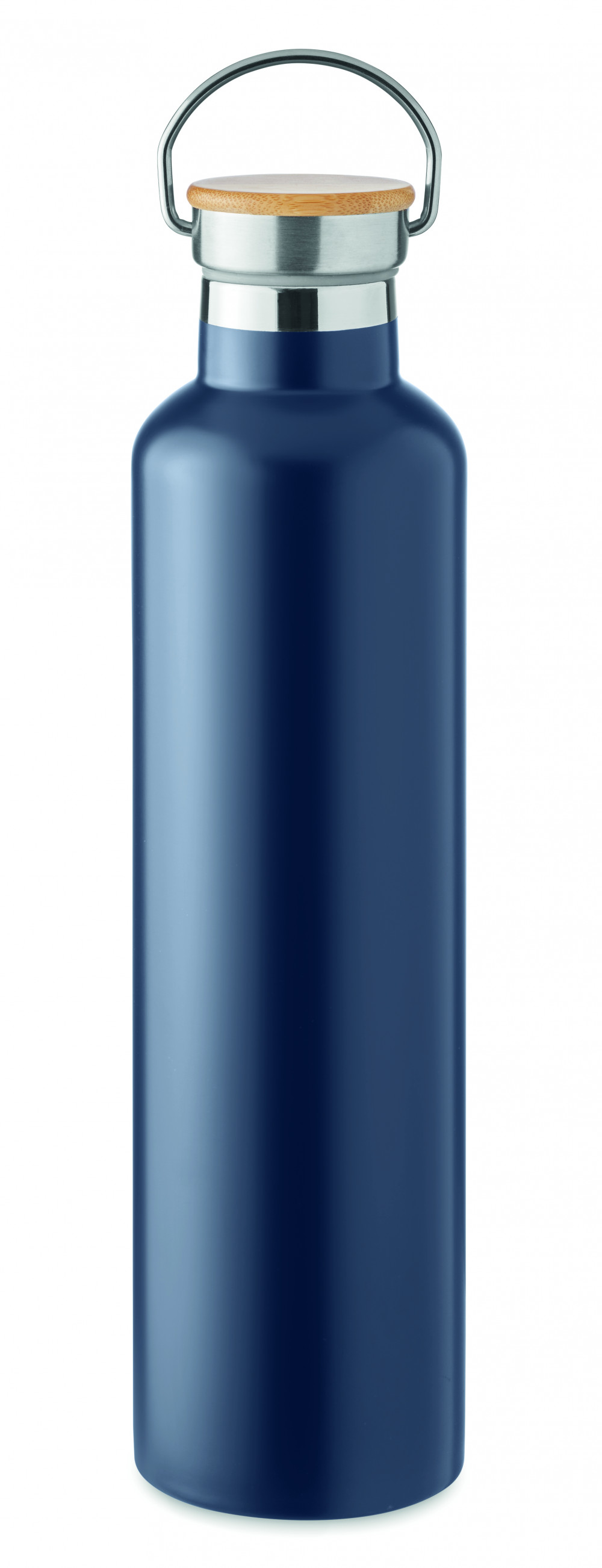 Duplafalú rozsdamentes acél termosz fém fogantyús bambusz kupakkal. Űrtartalom: 1 l. A bambusz természetes anyag, színében, mintázatában és méretében esetenként eltérő lehet.
