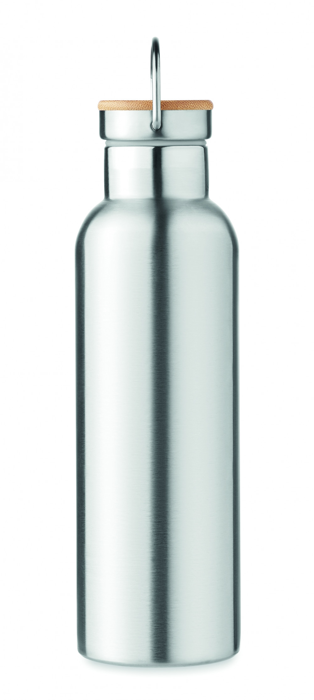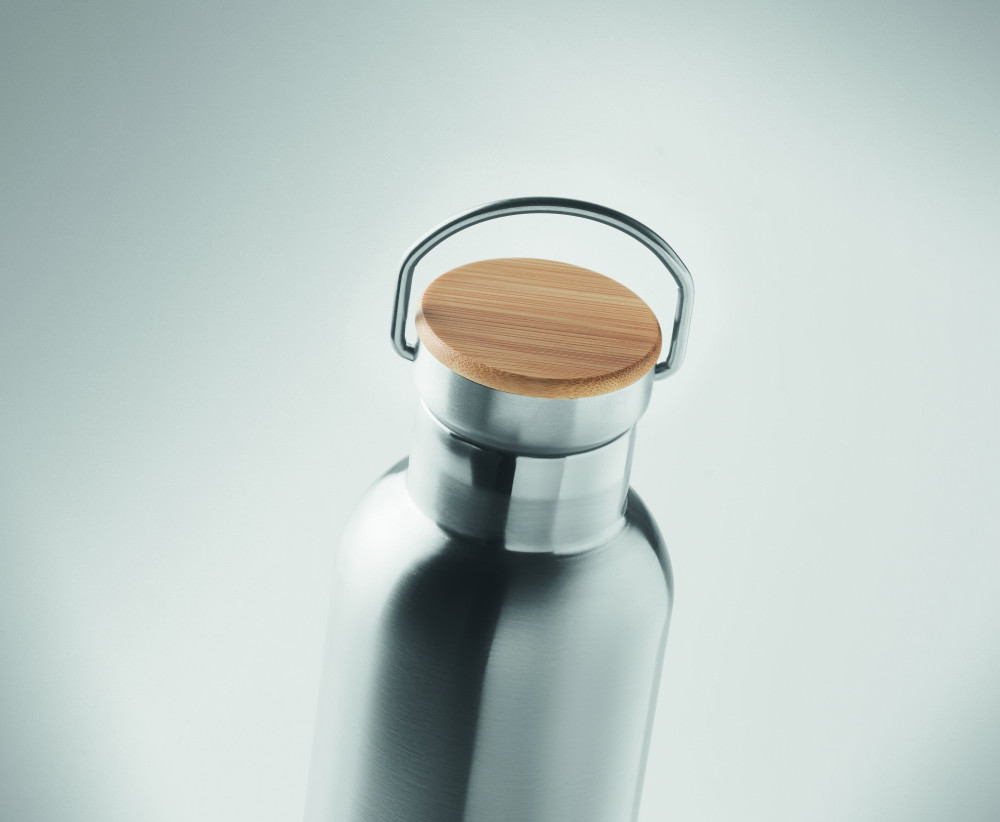 Duplafalú rozsdamentes acél termosz fém fogantyús bambusz kupakkal. Űrtartalom: 750 ml. Szivárgásmentes. A bambusz természetes anyag, színében, mintázatában és méretében esetenként eltérő lehet.