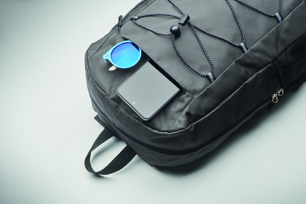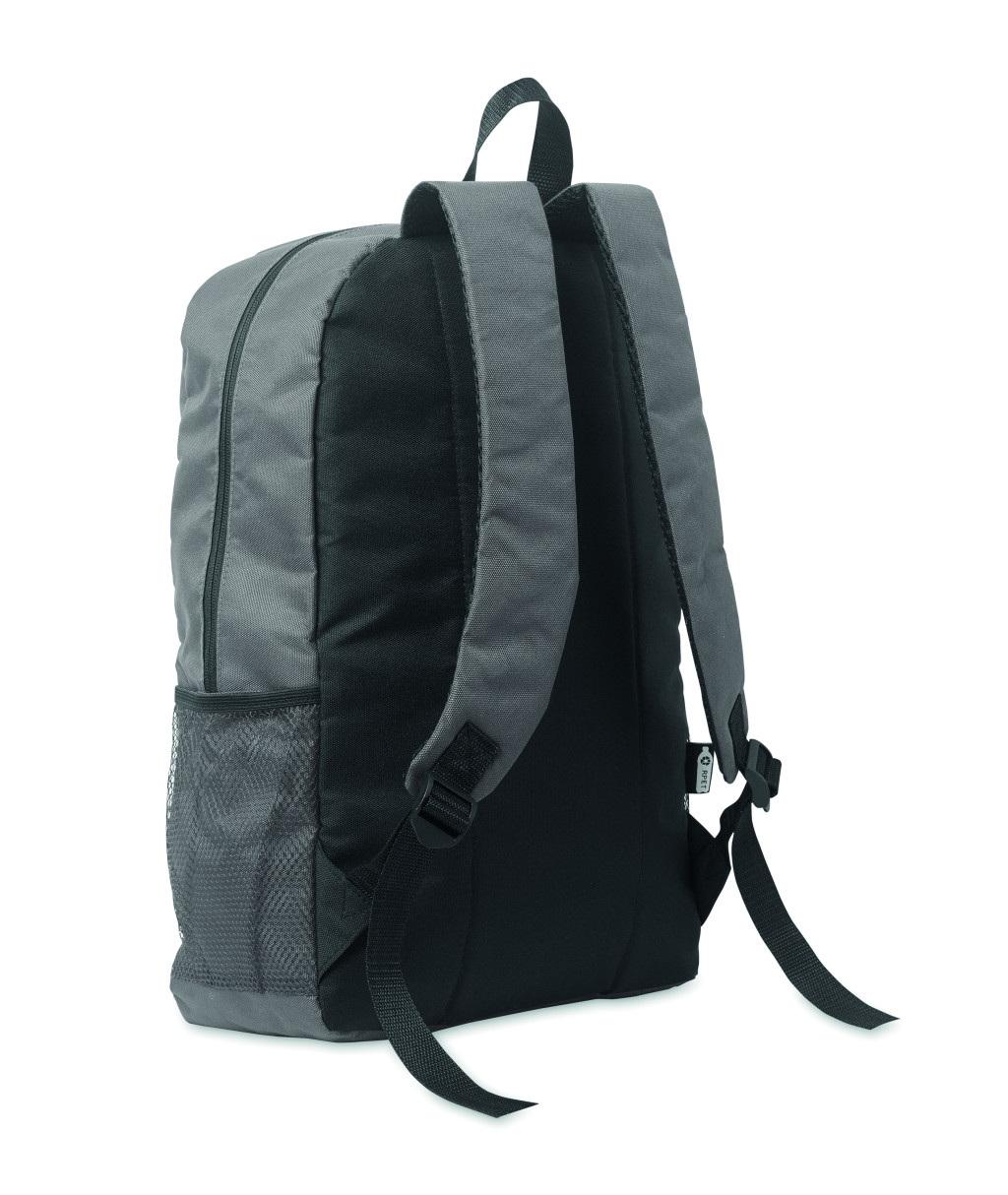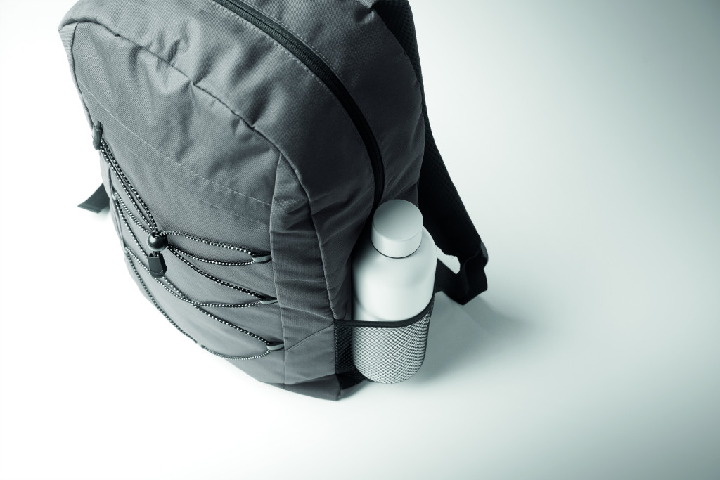 Hátizsák 600D RPET poliészterből, dekoratív zsinórral és cipzáras elülső zsebbel. Mindkét oldalán hálós zsebekkel.
