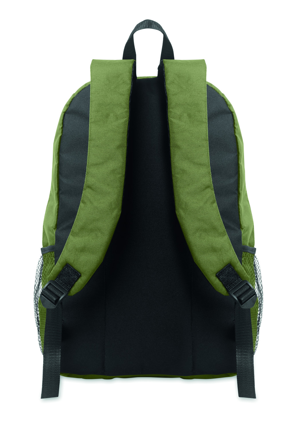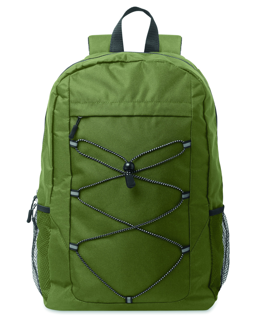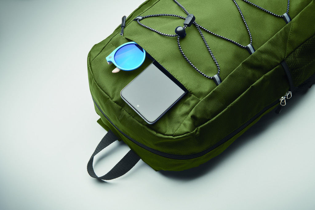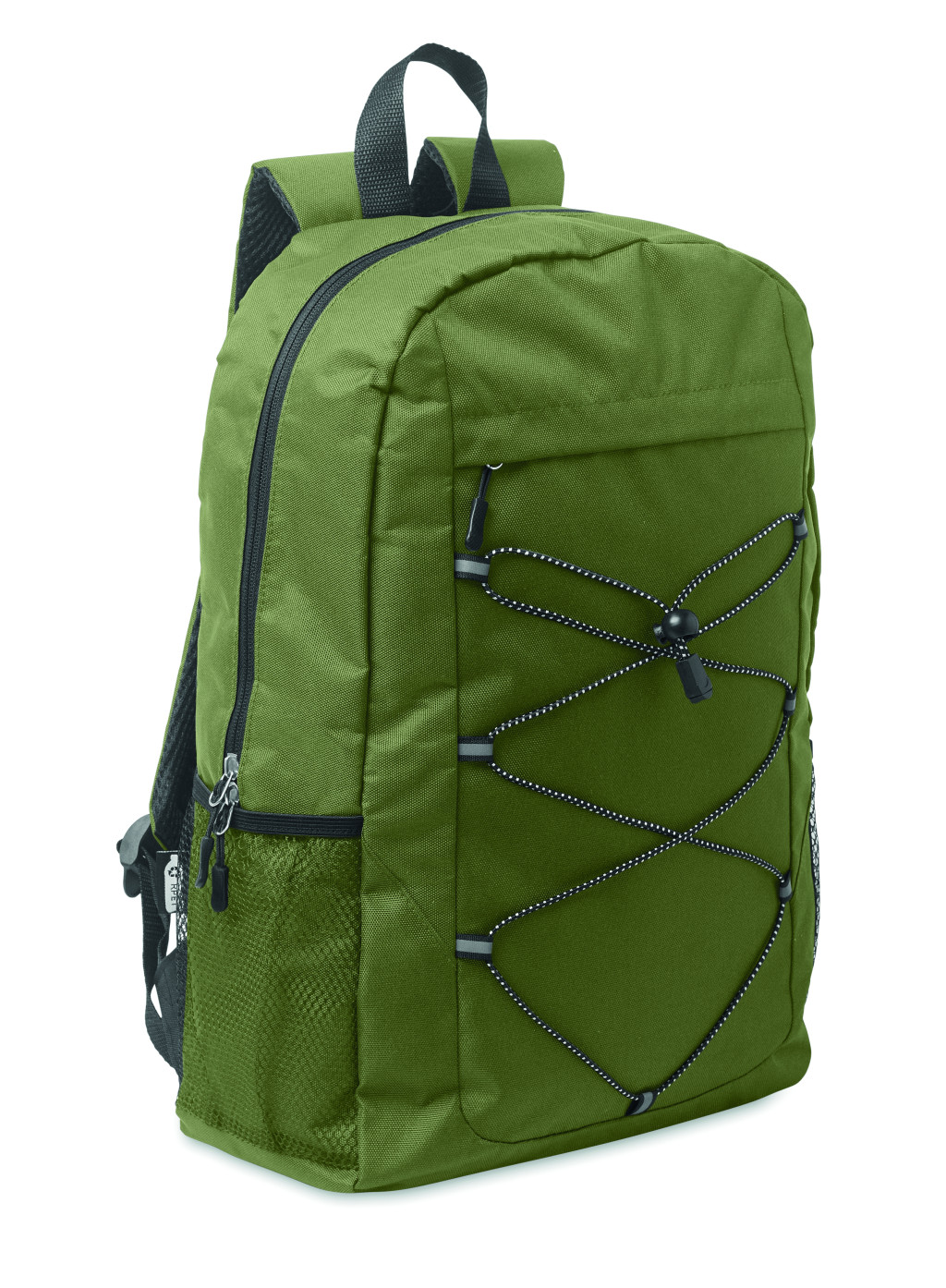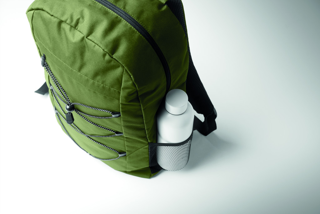 Hátizsák 600D RPET poliészterből, dekoratív zsinórral és cipzáras elülső zsebbel. Mindkét oldalán hálós zsebekkel.