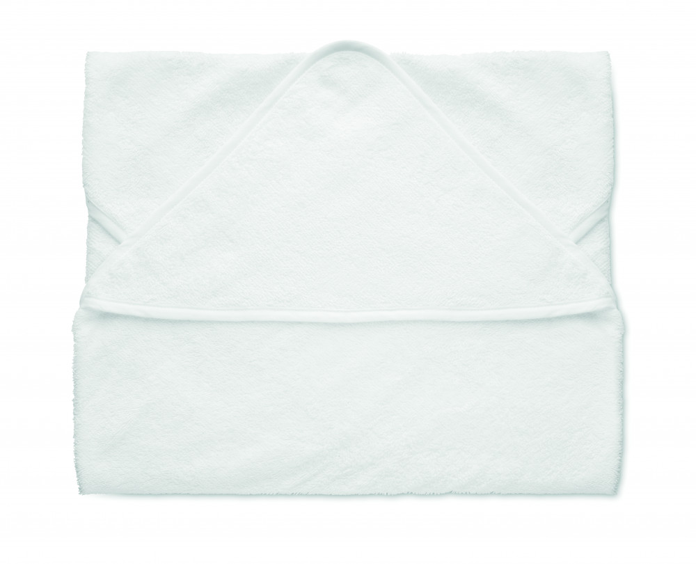 Pamutból készült kapucnis babatörölköző. 300 g/m² vastag anyag. Ez a termék OEKO-TEX® STANDARD 100 tanúsítvánnyal rendelkezik.