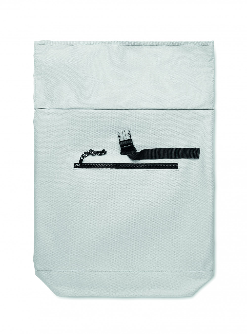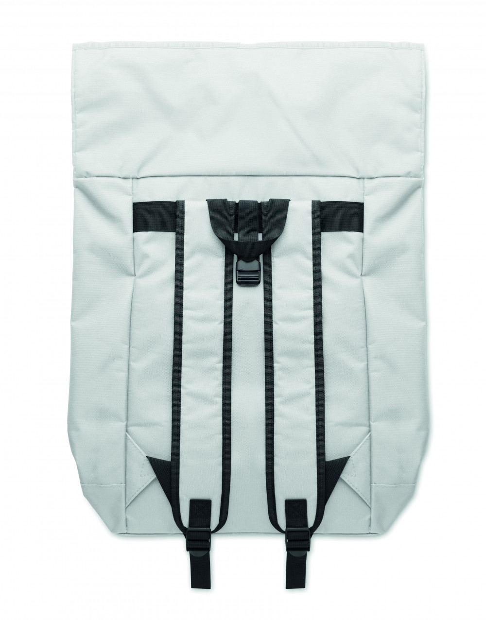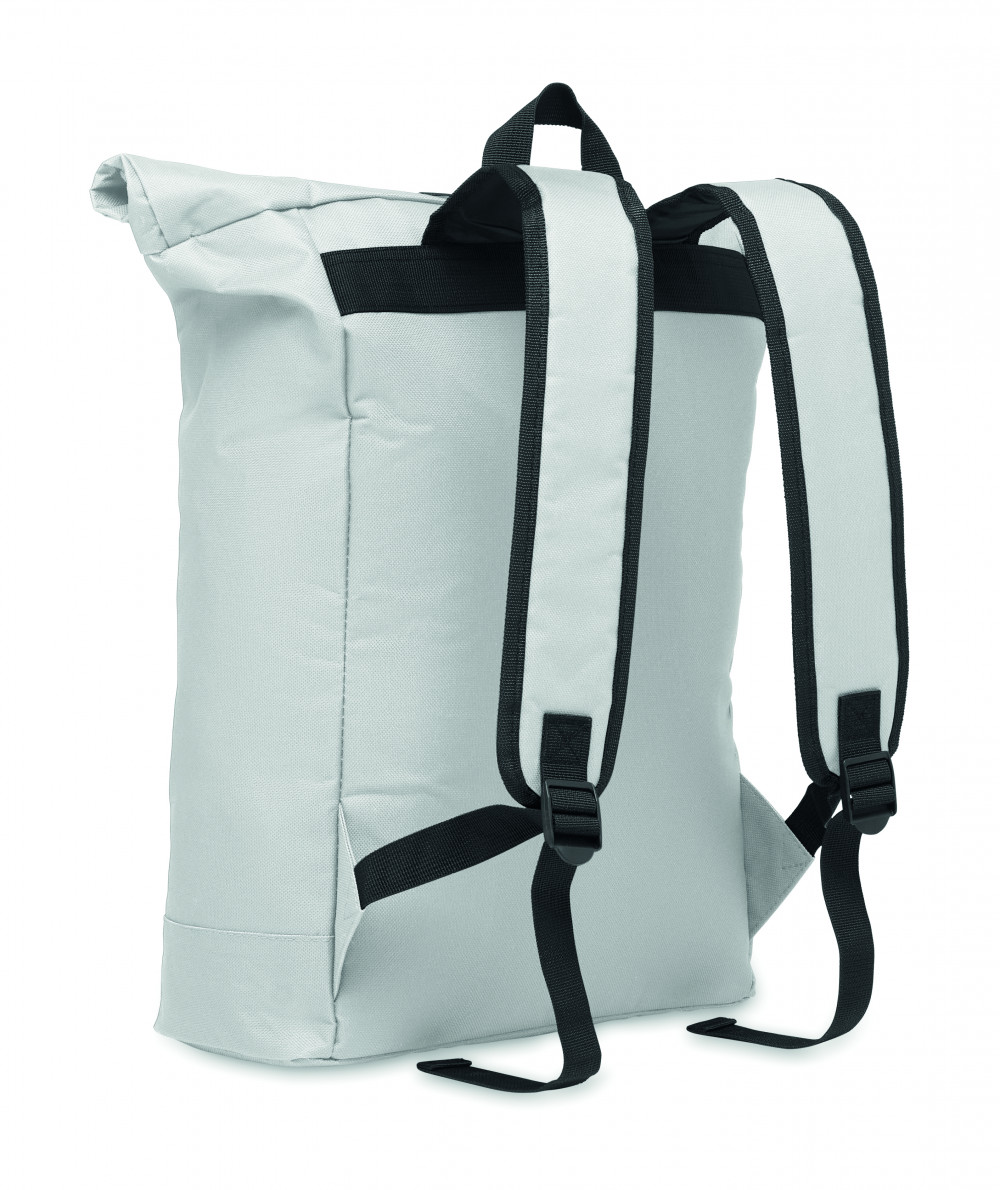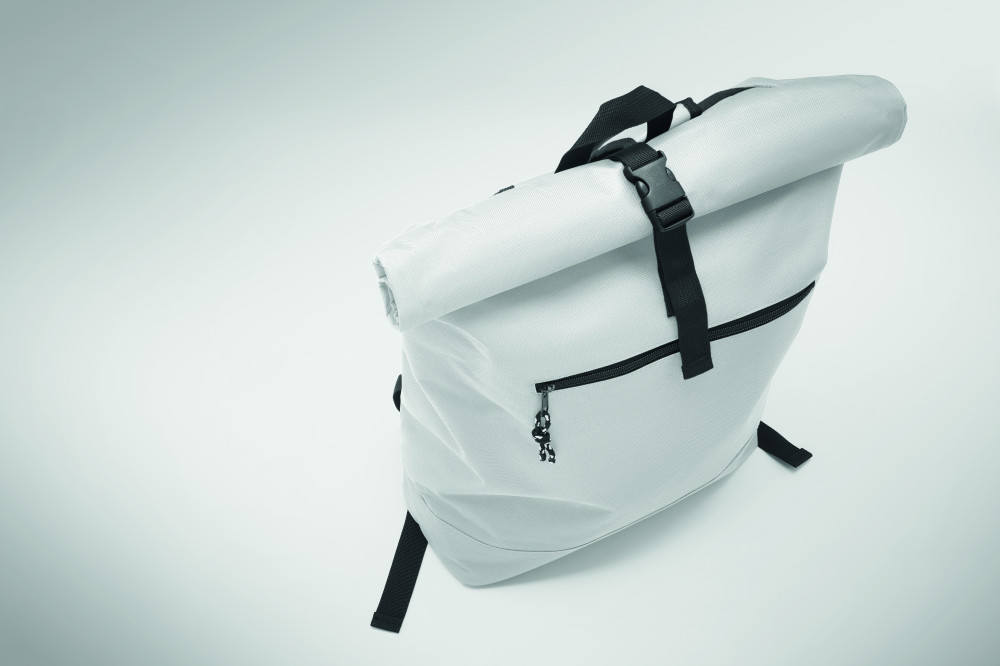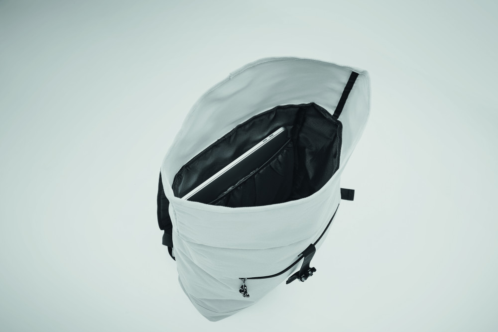 15 colos roll top csavart záródású laptop hátizsák 600D poliészterből, párnázott háttal és megerősített aljjal. Cipzáras elülső zseb. 210D bélés.